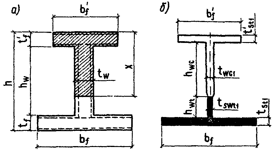 - толщина соответственно сжатой и растянутой полок двутаврового сечения;