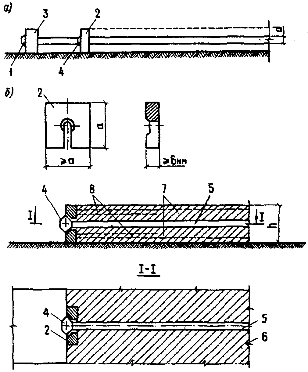 а - напрягаемая арматура, заанкеренная на упорах формы;