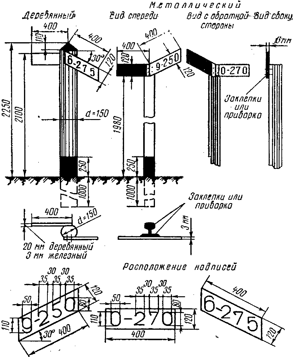 Столбы. Столбы путевых знаков изготовляются из строительного леса диаметром 150 - 170 мм с чистой острожкой и обделкой верха. Конец столба, закапываемый в землю, покрывается антисептиком или обжигается. Пикетные знаки могут быть каменные или бетонные.