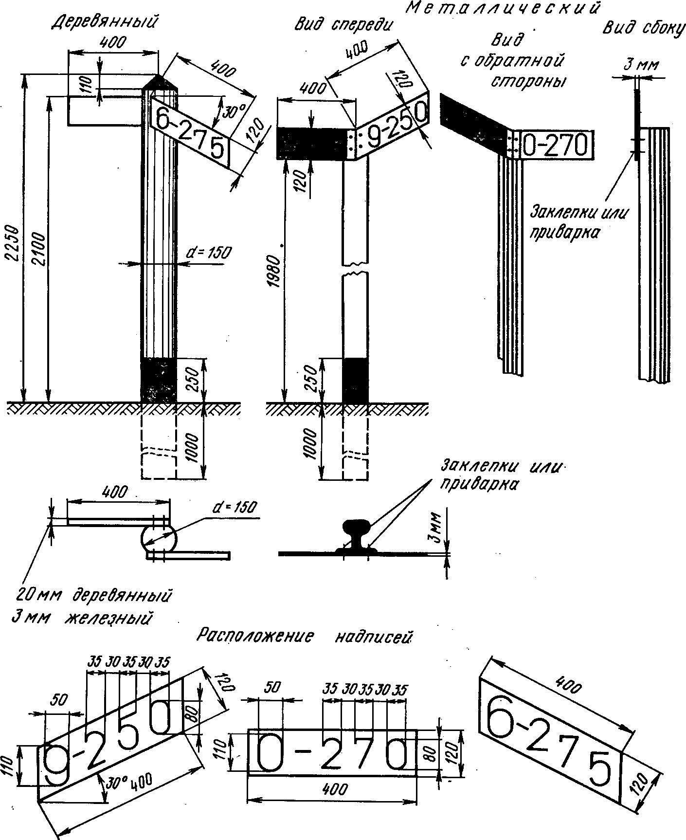 Столбы. Столбы путевых знаков изготовляются из строительного леса диаметром 150 - 170 мм с чистой острожкой и отделкой верха. Конец столба, закапываемый в землю, покрывается антисептиком или обжигается. Пикетные знаки могут быть каменные или бетонные.