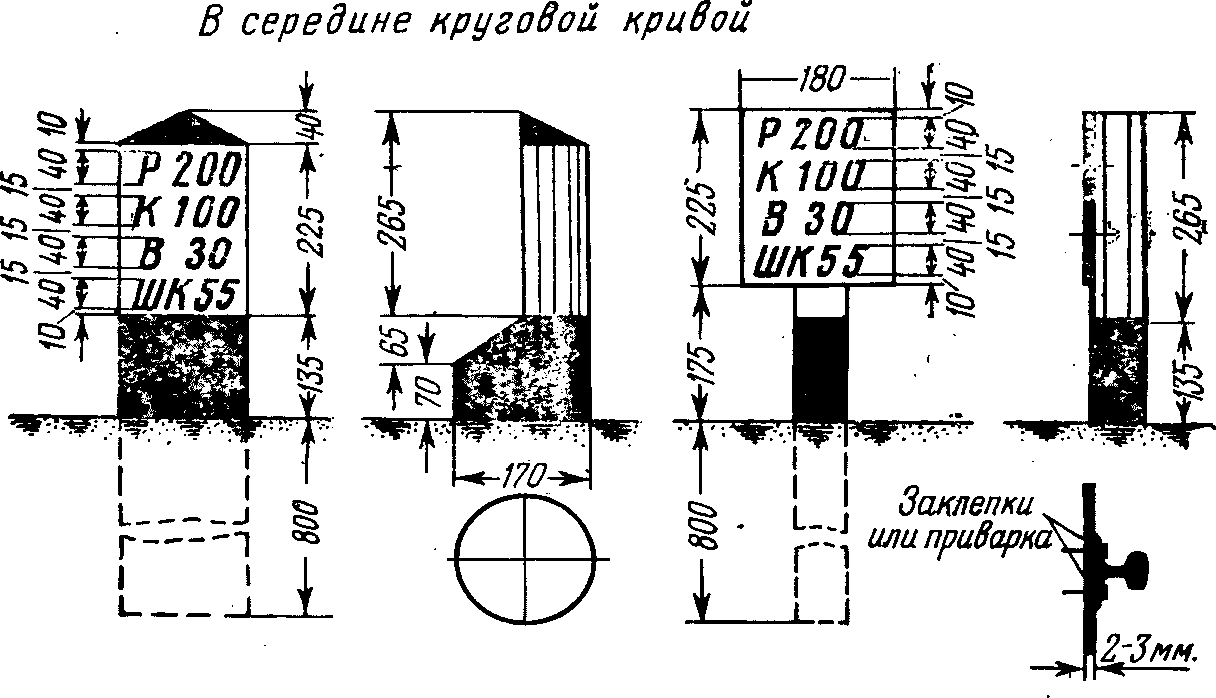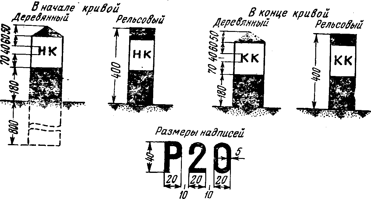 Могут применяться также пикетные знаки каменные и бетонные высокие, не превышающие уровня головки рельса, с цифрами тех же размеров, как и на деревянных знаках.