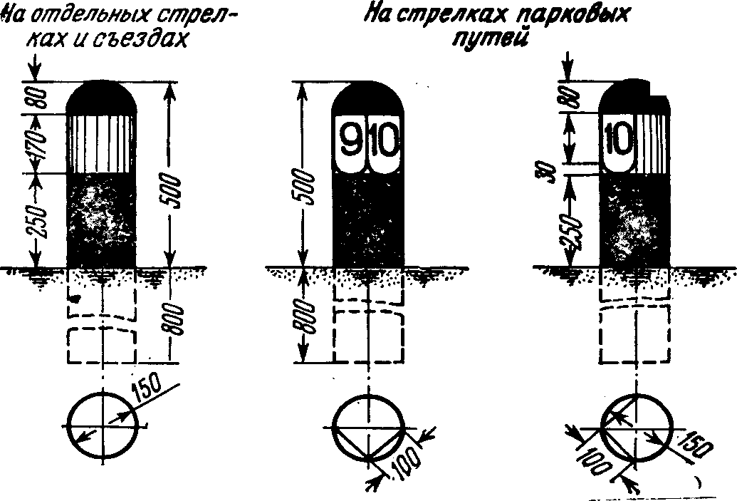 Цифры черного цвета. На срезах, обращенных острием к стрелке, указываются номера соответствующих станционных путей. Устанавливаются так, чтобы расстояние их между осью столбика и каждой из осей сходящихся путей было не меньше 1440 мм.