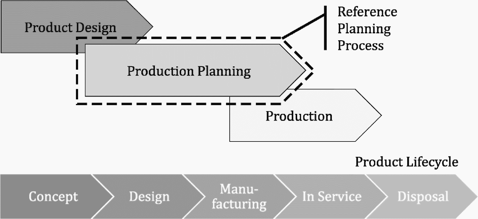Product Design - проектирование продукции; Reference Planning Process - стандартный процесс планирования; Production Planning - производственное планирование; Production - производство; Product Lifecycle - жизненный цикл продукции; Concept - концепция; Design - проектирование; Manufacturing - изготовление; In Service - эксплуатация; Disposal - утилизация