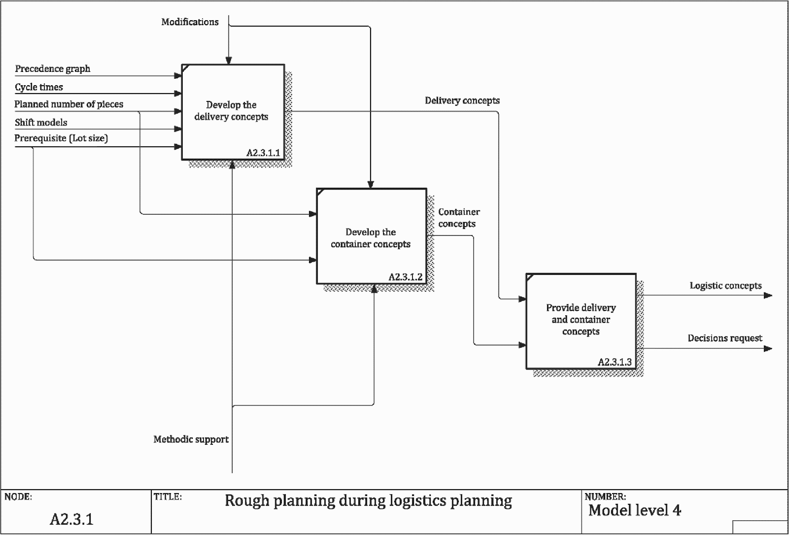 Modifications - модификации; First chaining concept - первичная концепция производственной цепочки; Detailed linking concept - детальная концепция связей; Internal logistics concept - концепция внутренней логистики; Layout concept based on planning scenario - концепция компоновки, основанная на сценариях планирования; Other requirements (structural restrictions) - другие требования (структурные ограничения); Methodic support - методическая поддержка; Defining layout of stations based on process chain - определение компоновки рабочих станций, основанной на производственной цепочке; Versioned layout concept - изменяемая концепция компоновки; Defining layout of machines and facilities - определение компоновки станков и производственных помещений; Defined layout - определенная компоновка; Node: A2.4.3 - процесс: A2.4.3; Title: Detailed planning during layout planning - наименование: Детальное планирование (в рамках планирования процесса компоновки); Number: Model level 4 - номер: Уровень 4 модели