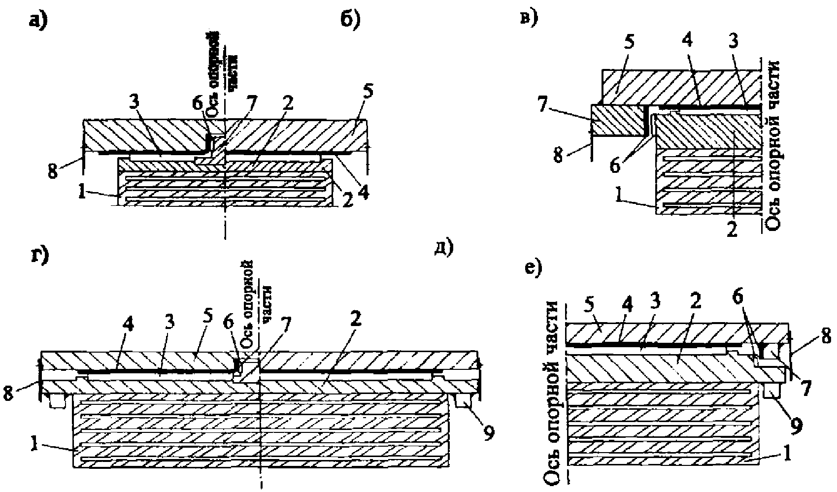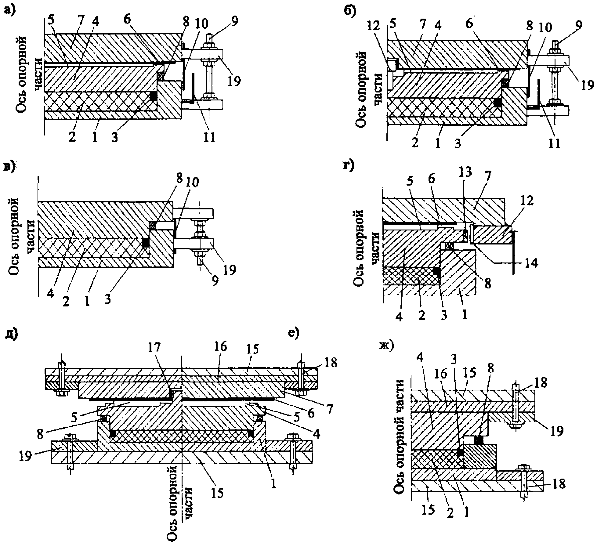 3.3. Опорные части с полимерными материалами подразделяются на типы: резиновые армированные, резинофторопластовые, стаканные и сферические (шаровые сегментные).