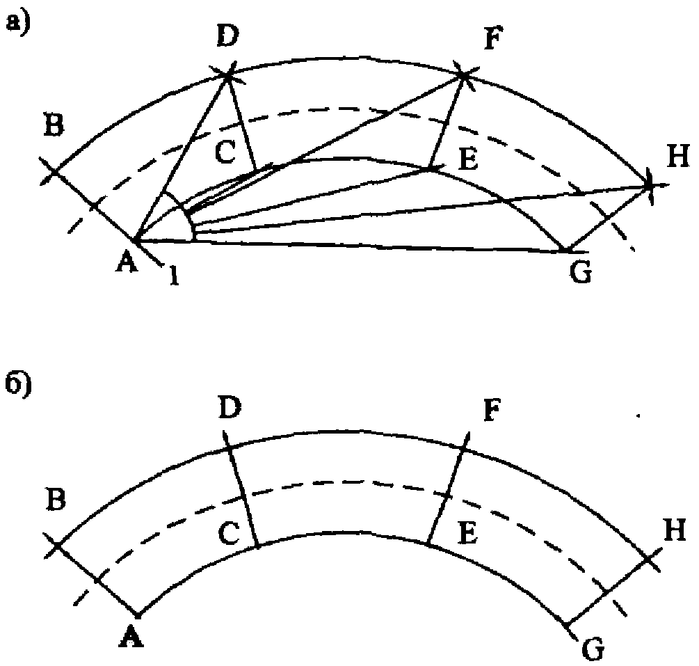 4.1.4. Для криволинейных в плане балочных пролетных строений предусматривают полюсно-лучевое или тангенциальное расположение опорных частей (рис. 1).