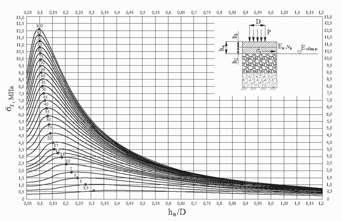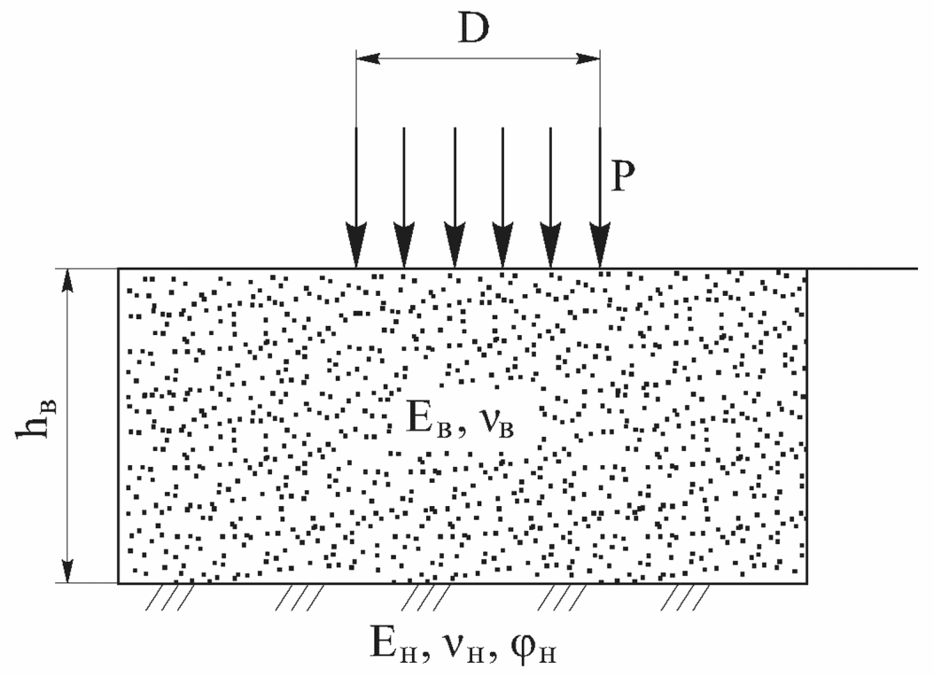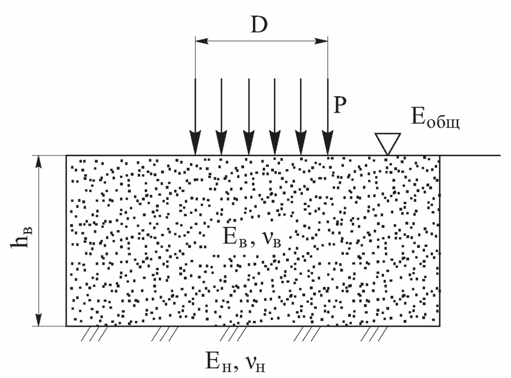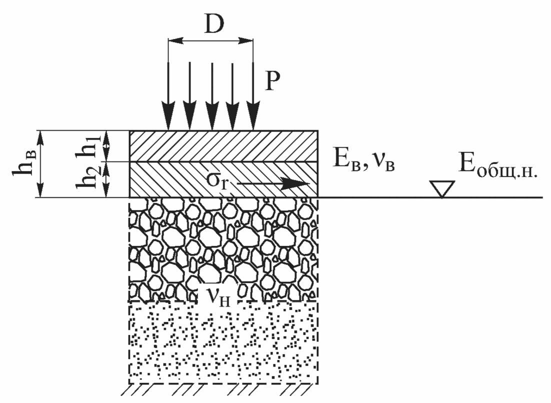 В связи с тем что точный учет фактического распределения нагрузки от колеса автомобиля по следу, имеющему форму, близкую к эллипсу, значительно усложняет задачу, при этом основное значение имеет распределение нагрузки в нижних наиболее слабых слоях основания и в грунте земляного полотна, с достаточной для практических целей точностью определено, что при проектировании дорожной одежды принимается схема нагружения конструкции колесом автомобиля в виде одной гибкой круговой площадки диаметром D, равновеликой отпечатку колеса и передающей покрытию равномерно распределенную нагрузку с давлением P.