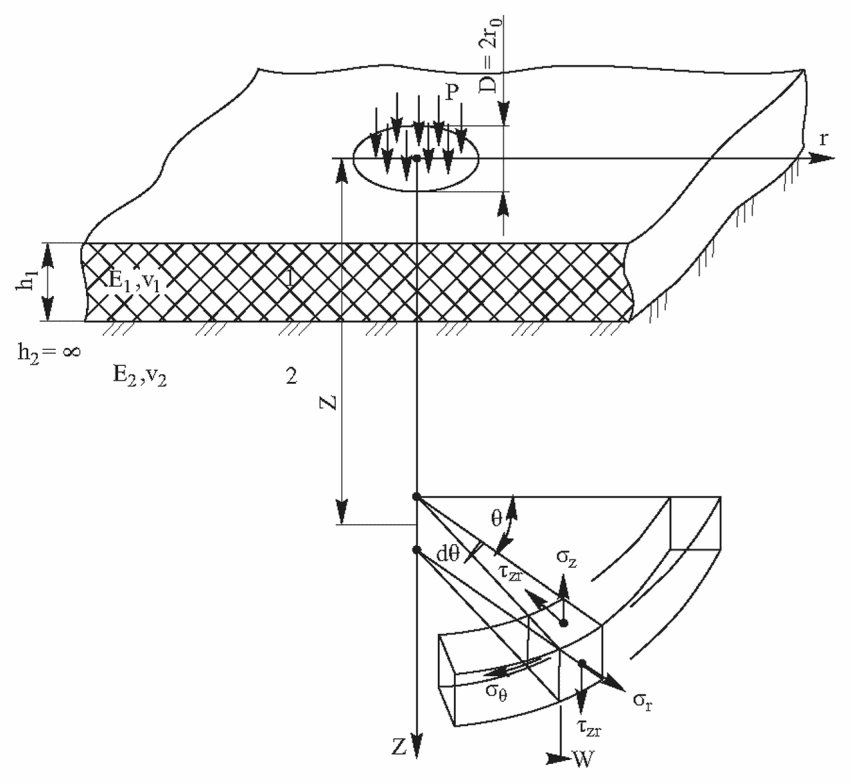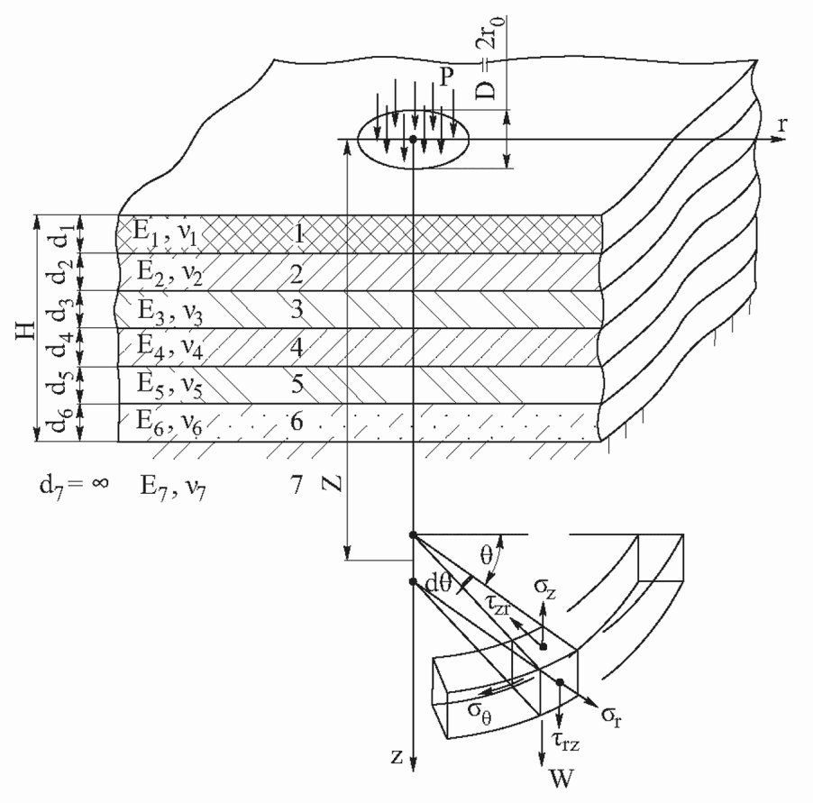 Дорожная одежда и грунт земляного полотна при оценке напряженно-деформированного состояния рассматриваются как слоистый массив, ограниченный сверху горизонтальной плоскостью и неограниченно простирающийся вниз.