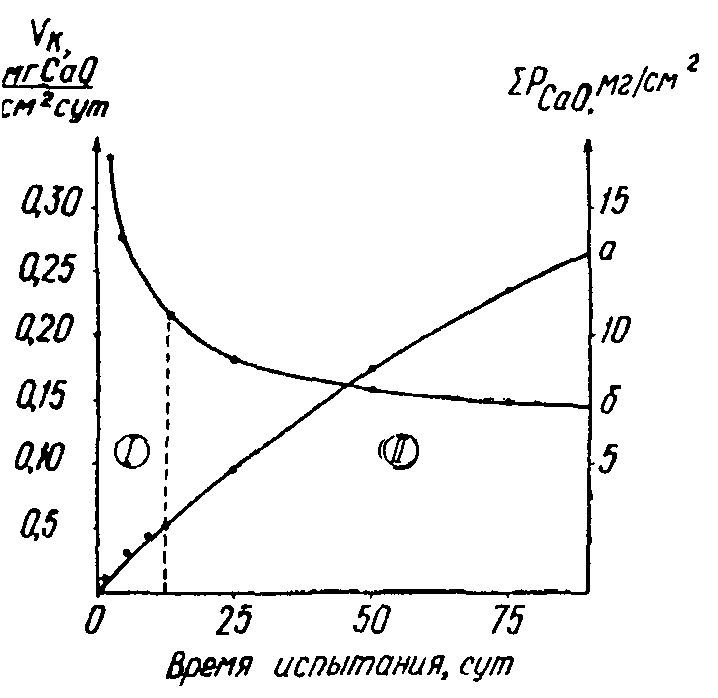Длительность процесса коррозии бетона в диффузионно-кинетической области колеблется от 6 до 60 сут (время до выхода процесса на прямую) в зависимости от фазового состава, структуры и толщины слоя продуктов коррозии.
