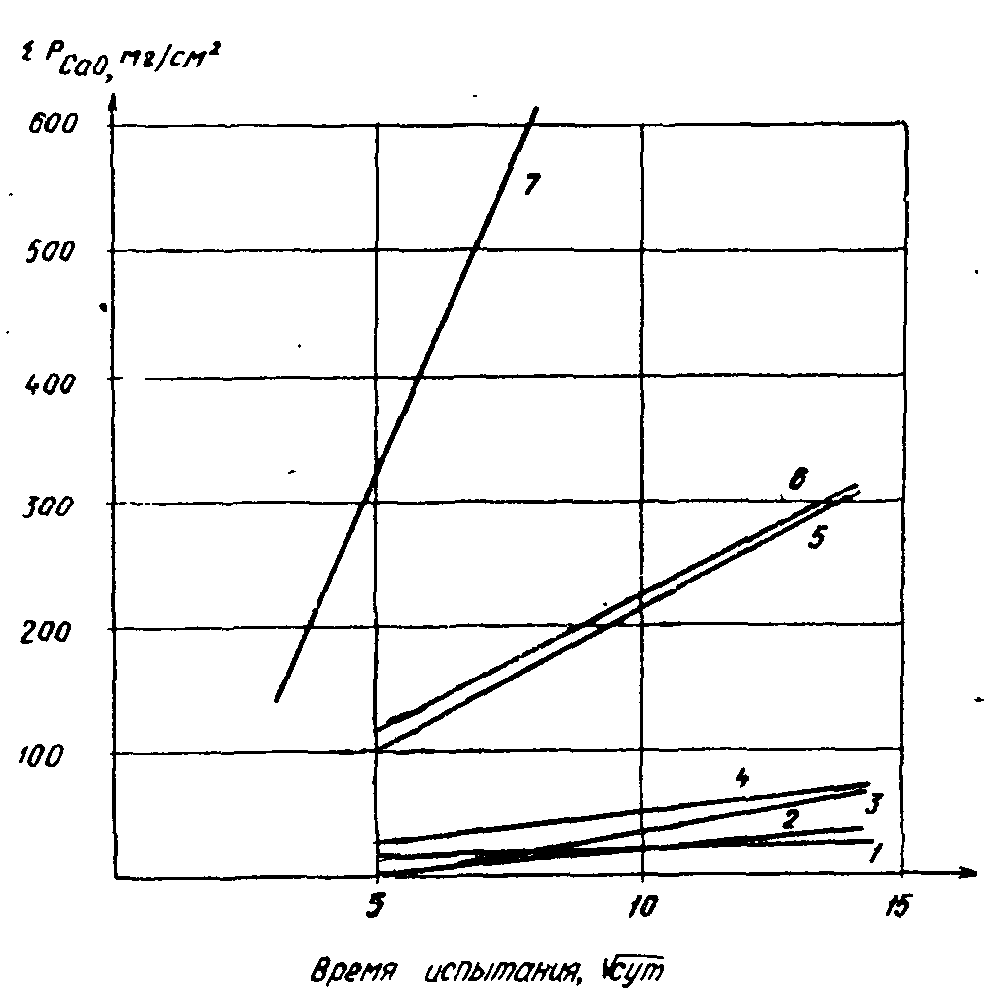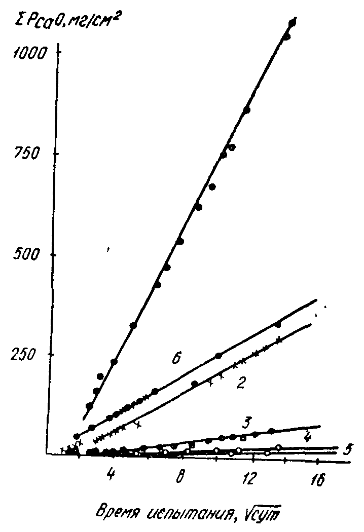 4. При рассмотрении гетерогенного процесса - коррозии бетона с позиций диффузионной кинетики установлено, что между двумя крайними областями развития процессов коррозии - кинетической, в которой скорость коррозии определяется скоростью химического взаимодействия или растворения, и диффузионной, в которой скорость реакции определяется диффузией реагирующих веществ к реакционной поверхности, лежит переходная область диффузионно-кинетическая, в которой соизмеримы скорости химического взаимодействия или растворения и переноса вещества диффузией. Обработка экспериментальных данных показала, что коррозия бетона в сроках, соизмеримых со сроками эксплуатации конструкций, протекает в диффузионной области, для которой характерна прямолинейная зависимость глубины разрушения от корня квадратного из времени (рис. 4).
