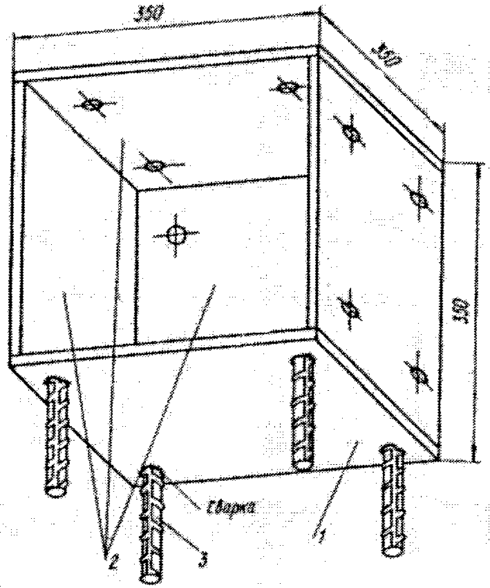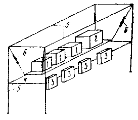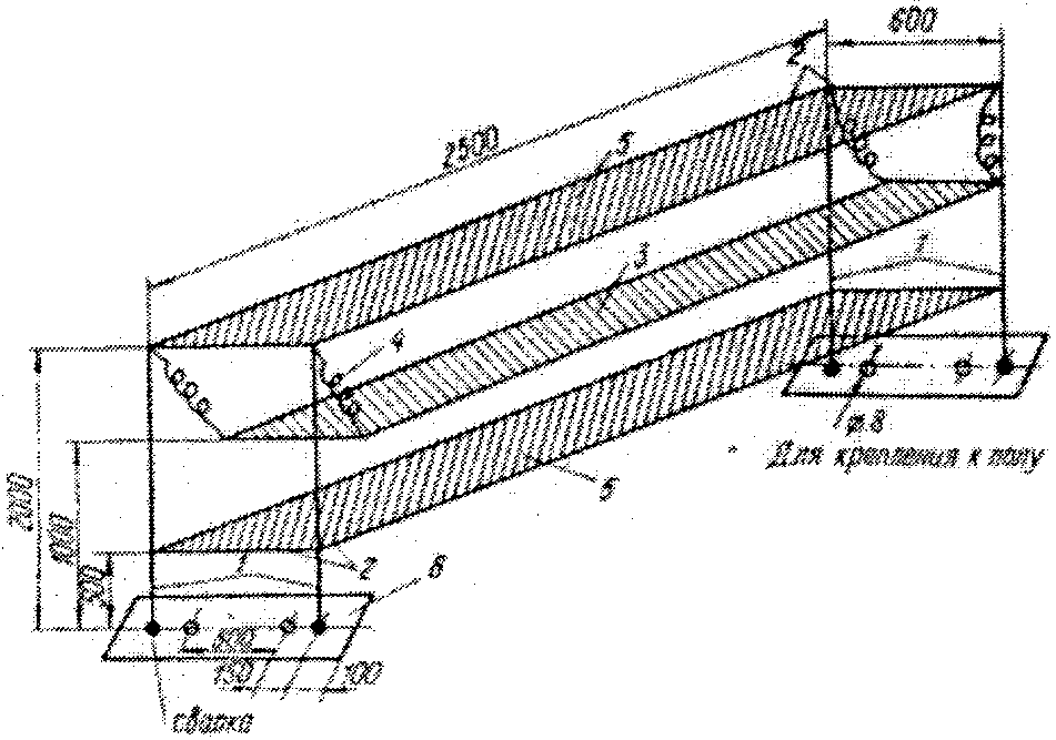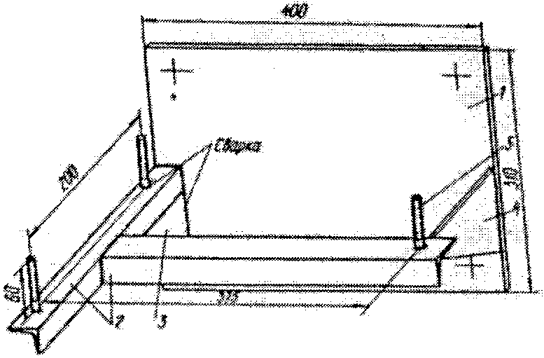 Каркас устройства сварен из стального уголка 63 x 63 x 6 (1), 32 x 32 x 4 (2). Осциллографы установлены на подвесной площадке (3). Площадка подвешена на четырех пружинах (4), имеющих в нагруженном состоянии длину 1 м. Шунтовые коробки укреплены на плите (5). Для крепления к полу приварены стальные пластины (6).