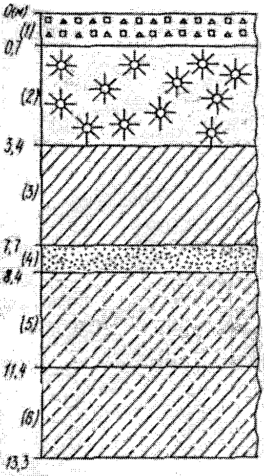 (6) - суглинки желто-бурые (пластичные, влажные с гравием различных изверженных пород до 10%; грунт имеет плотное сложение).