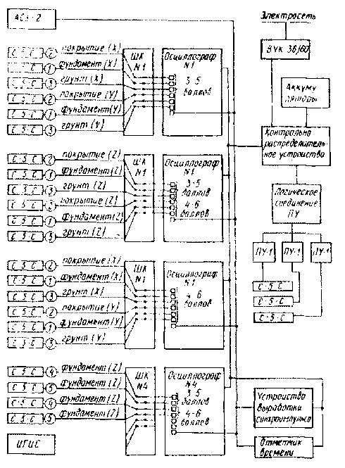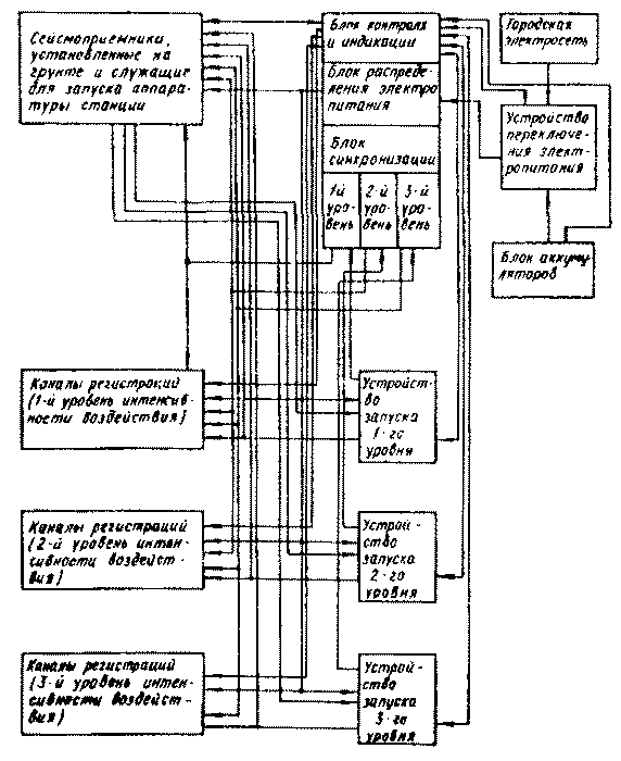 2.3. На станции ИСС должно осуществляться: автоматическое включение аппаратуры, находящейся в ждущем режиме станции при заданных уровнях колебаний грунта; синхронизация в записях движения элементов сооружения и прилегающих участков грунта на всех измерительных пунктах; регистрация поведения элементов сооружения и движения грунта в заданном интервале интенсивности землетрясений; автоматическое энергоснабжение станции во всех условиях работы; функциональный контроль работоспособности станции. Рекомендуемая структурная схема инженерно-сейсмометрической станции приведена на рис. 1.