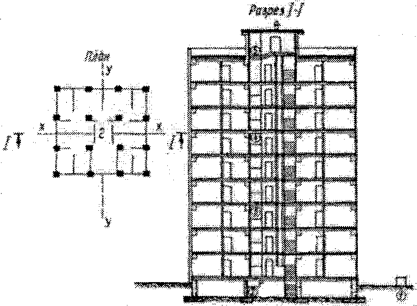 рис. 2 настоящих рекомендаций. Количество измерительных пунктов зависит от высоты здания и выбирается из расчета: три измерительных пункта на 3 - 4 этажа здания. Измерительные пункты располагаются в плоскости большой оси здания. Измерительные пункты, располагаемые по вертикальной оси здания вблизи его геометрического центра, регистрируют три взаимно перпендикулярные компоненты, а измерительные пункты, им соответствующие и расположенные в указанной вертикальной плоскости, на тех же перекрытиях регистрируют горизонтальные компоненты движения и располагаются симметрично относительно центральных измерительных пунктов по соответствующей вертикальной оси для всех перекрытий. Измерительный пункт на грунте устанавливается в соответствии с