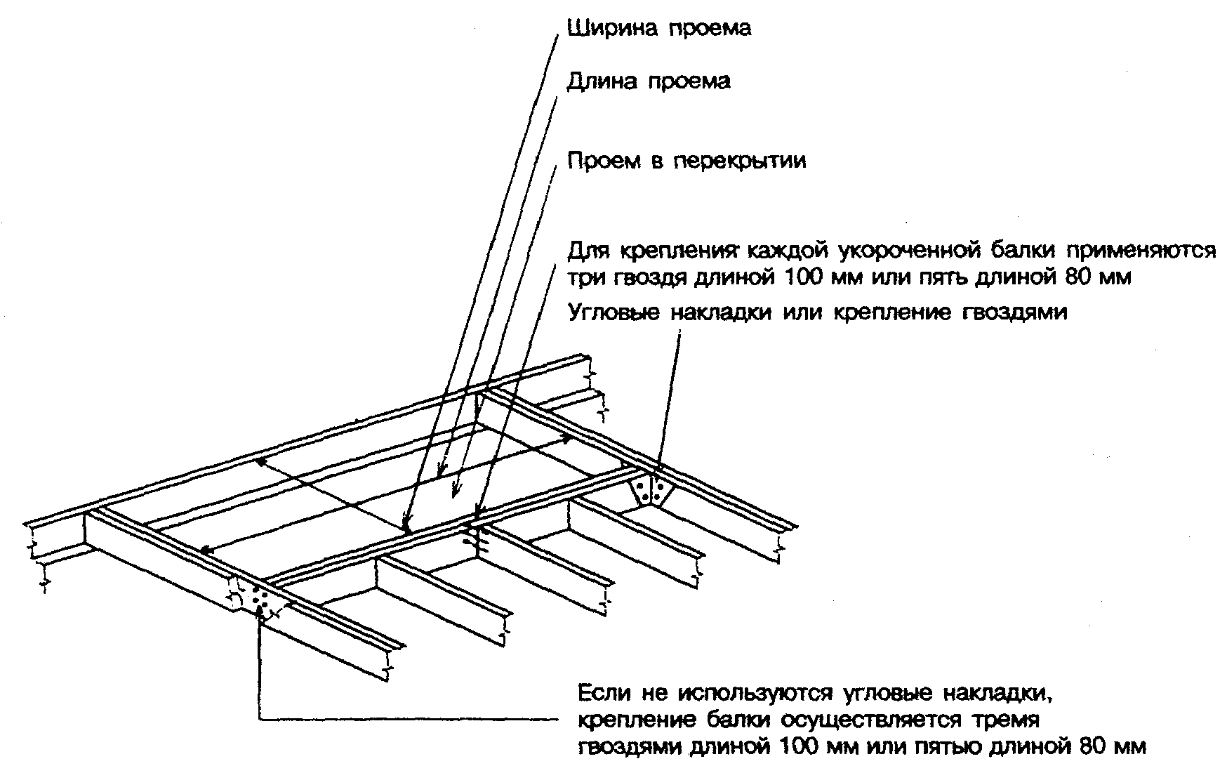 Примечания. 1. Конструкционная обшивка минимальной толщиной 9,5 мм должна крепиться не менее чем двумя рядами крепежных деталей к наружной поверхности перемычки и одним рядом крепежных деталей к верхней части стоек деревянного каркаса. 2. Пролеты рассчитаны, основываясь на максимальной ширине грузовой площади 4,9 м для балки или стропила и 9,8 м для фермы. Пролеты могут быть увеличены на 5% при ширине грузовой площади более 4,3 м и на 10% при ширине грузовой площади не более 3,7 м. 3. Если балки перекрытий перекрывают пролет на всю ширину здания без опоры, пролеты перемычек должны быть уменьшены на 15% в графе "Крыша, чердачное перекрытие и один этаж", на 20% в графе "Крыша, чердачное перекрытие и два этажа" и на 25% в графе "Крыша, чердачное перекрытие и три этажа". 4. Для концов перемычек, полностью опирающихся на стены, предусматривают опорную поверхность не менее 38 мм для перемычек пролетом не более 3 м и не менее 76 мм для перемычек пролетом более 3 м. 5. Вместо двух досок толщиной 38 мм можно использовать один брус толщиной 89 мм. 6. Пролеты по данной таблице применимы лишь в случаях, когда равномерно распределяемая временная нагрузка на перекрытия не превышает 2,4 кПа |