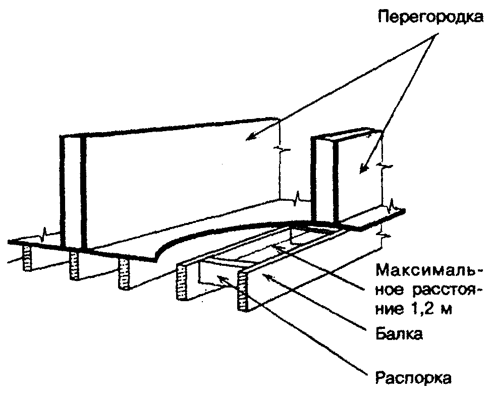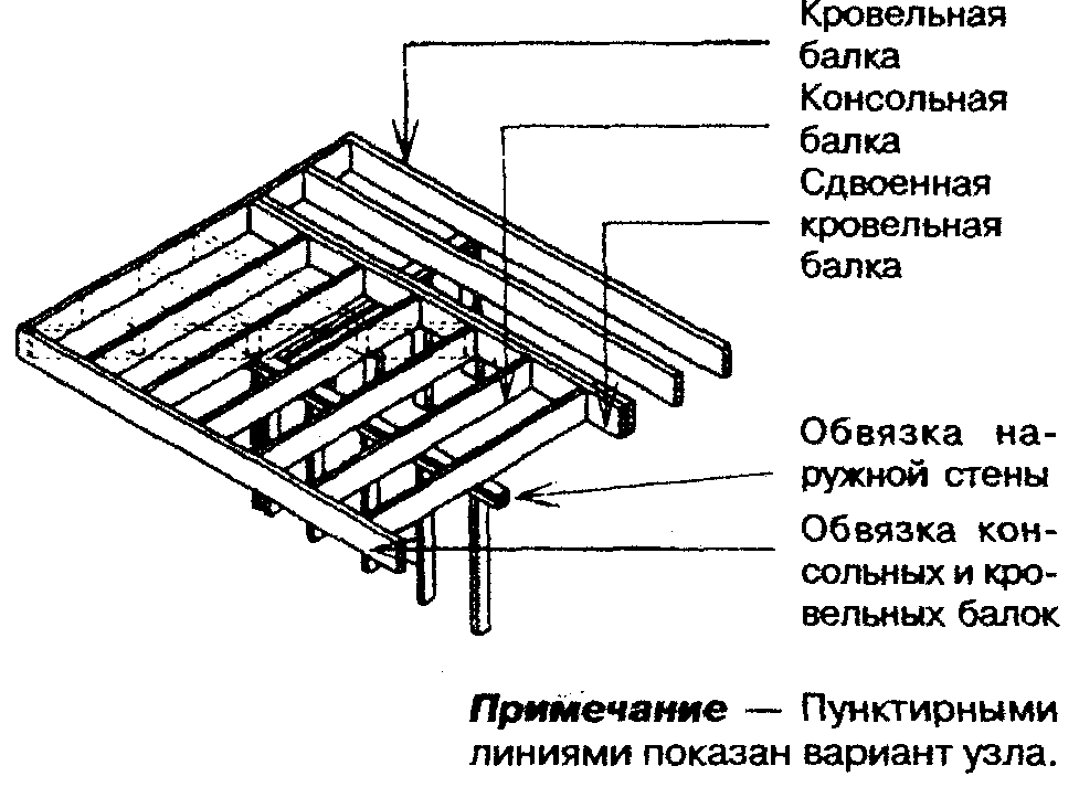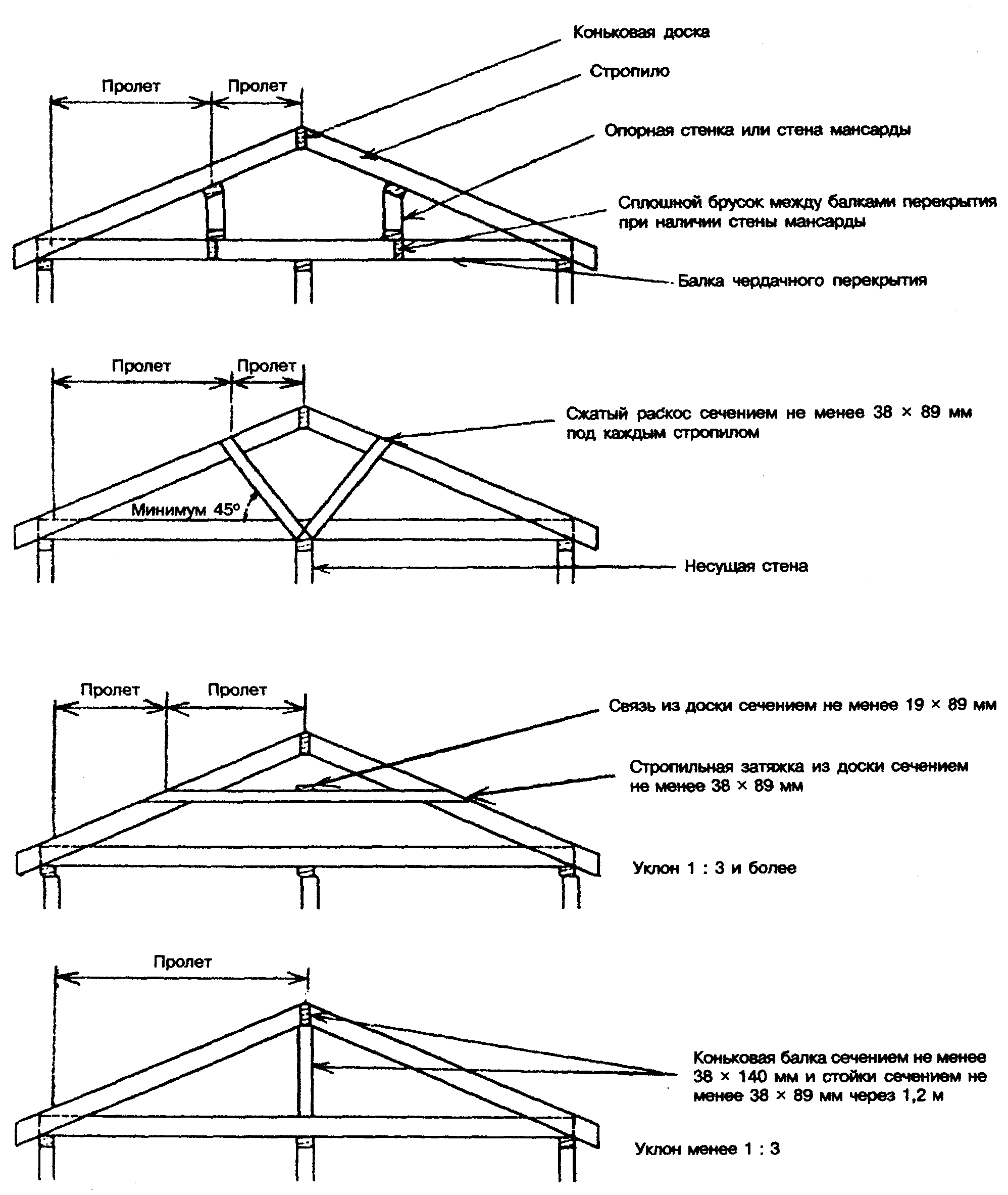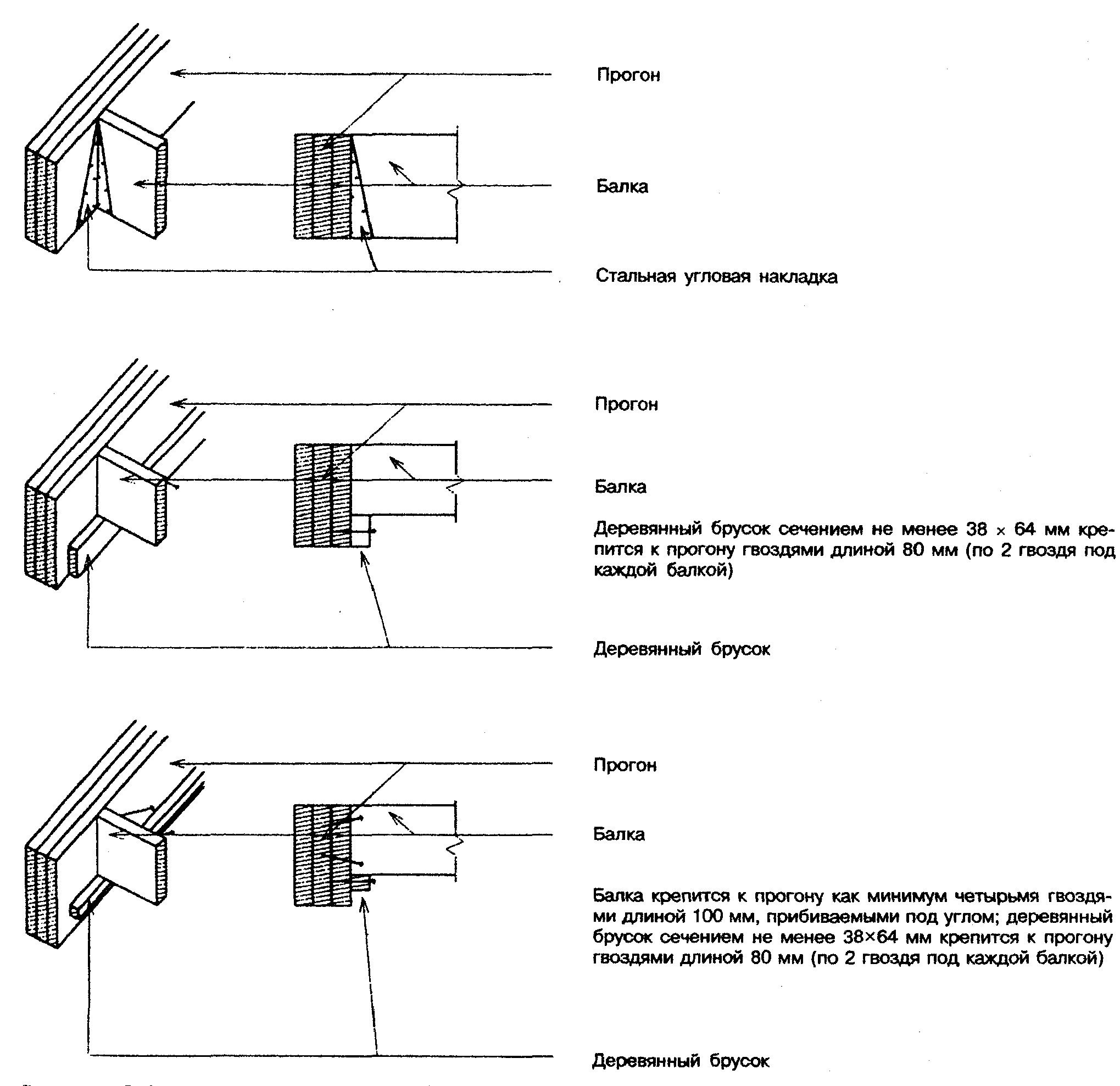 Примечания. 1. Пролеты рассчитаны, основываясь на максимальной ширине грузовой площади 4,9 м для балки или стропила и 9,8 м для фермы. Пролеты могут быть увеличены на 15% при ширине грузовой площади более 3,7 м и на 35% при ширине грузовой площади не более 2,4 м. 2. Для концов перемычек, полностью опирающихся на стены, предусматривают опорную поверхность не менее 38 мм для перемычек пролетом до 3 м и не менее 76 мм для перемычек пролетом более 3 м. |