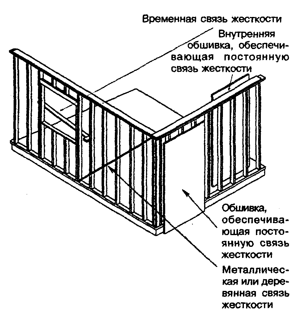 устройство каркаса наружных и внутренних несущих стен (как правило, предусматривается сборка каркаса участков стен в горизонтальном положении на перекрытии и последующая установка его в проектное положение без применения кранового оборудования);