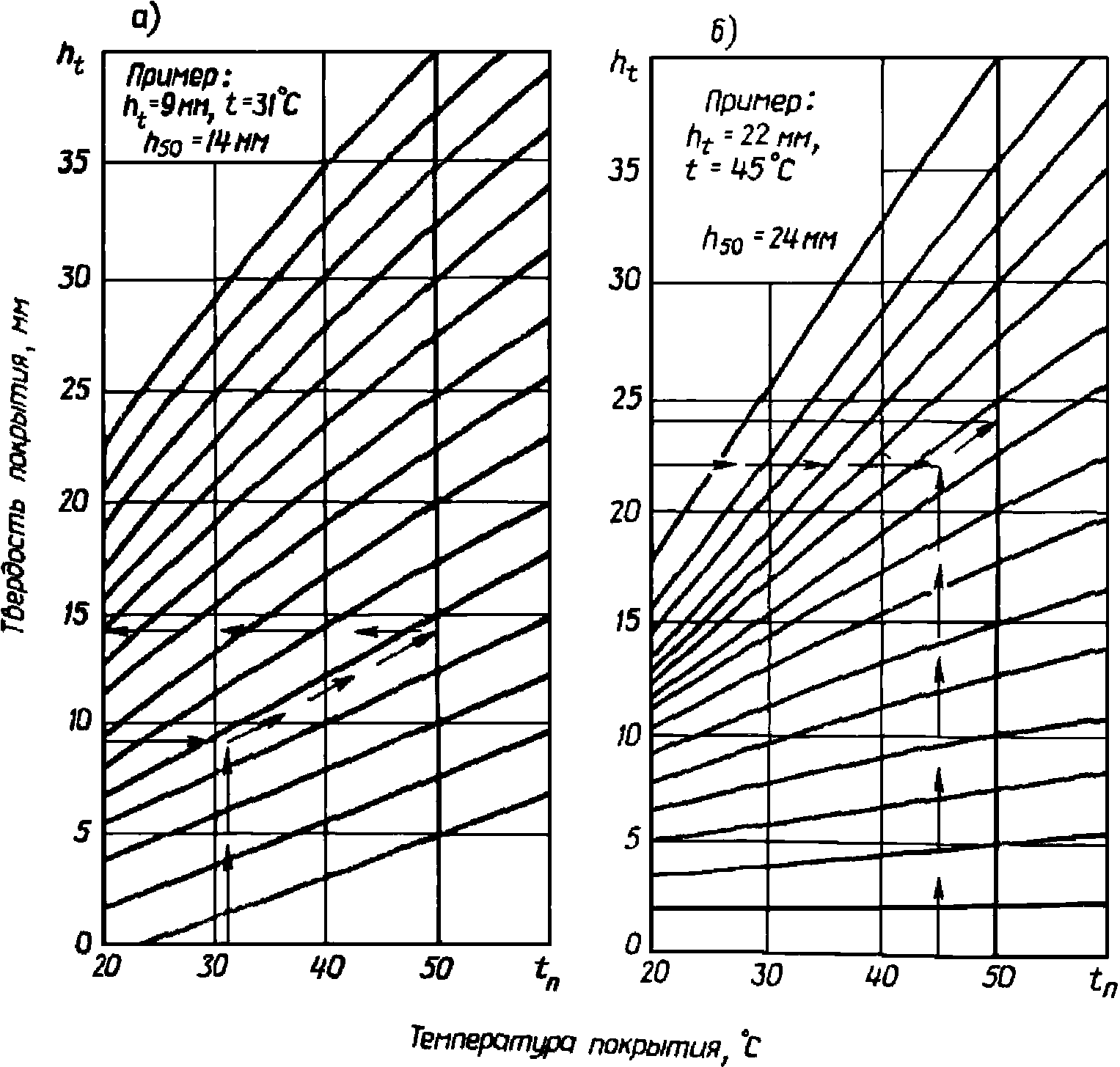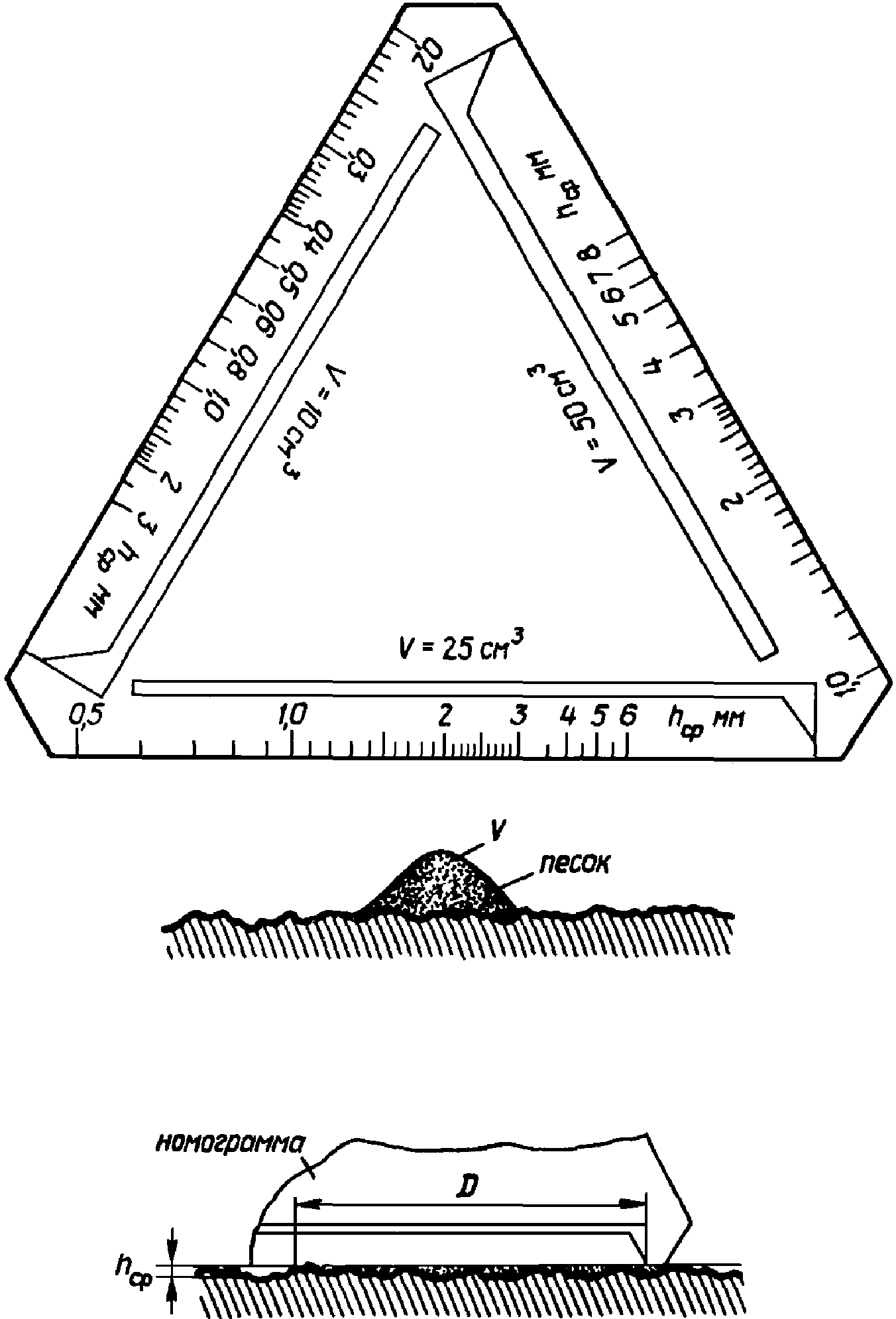 Среднюю глубину шероховатости определяют по шкале номограммы, соответствующей выбранному объему порции песка, прикладывая шкалу к диаметру песчаного пятна, как показано на