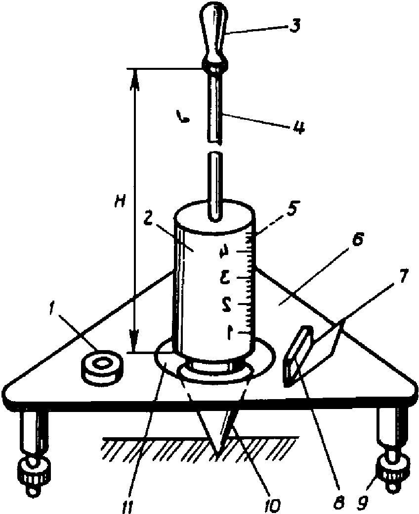 состоит из двух мерных стаканчиков вместимостью 10 и 25 см3 для дозирования песка; диска диаметра 100 мм, оклеенного с нижней стороны резиной, предназначенного для распределения песка по поверхности покрытия;