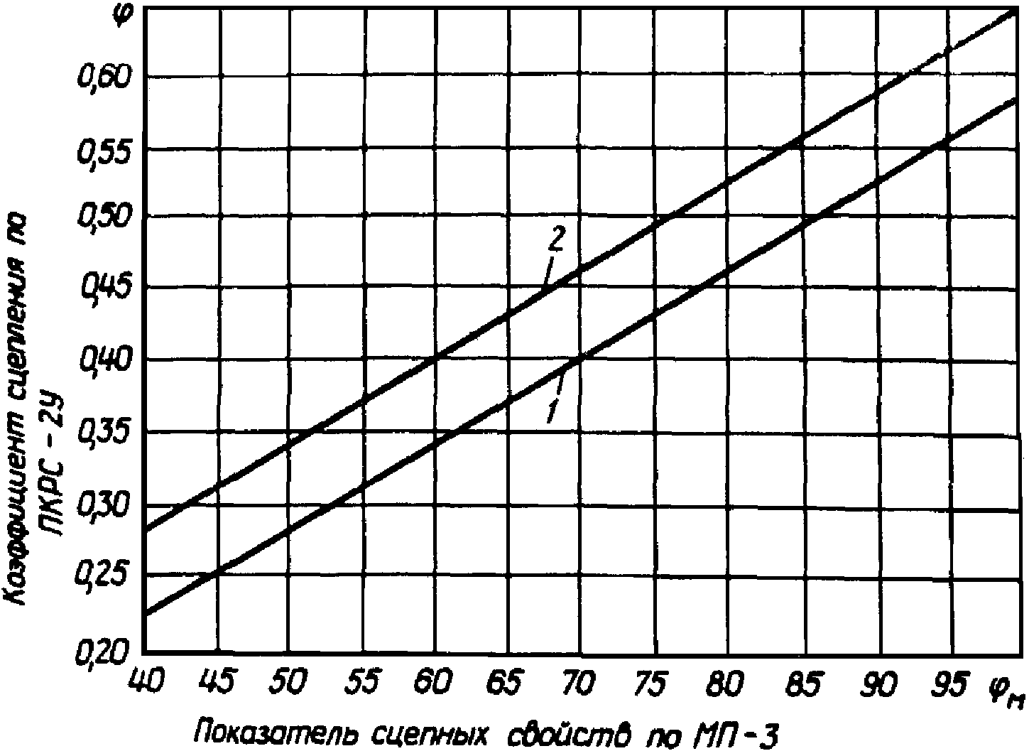Коэффициент сцепления колеса автомобиля с дорожным покрытием (при скорости 60 км/ч) определяют по корреляционному графику (см.