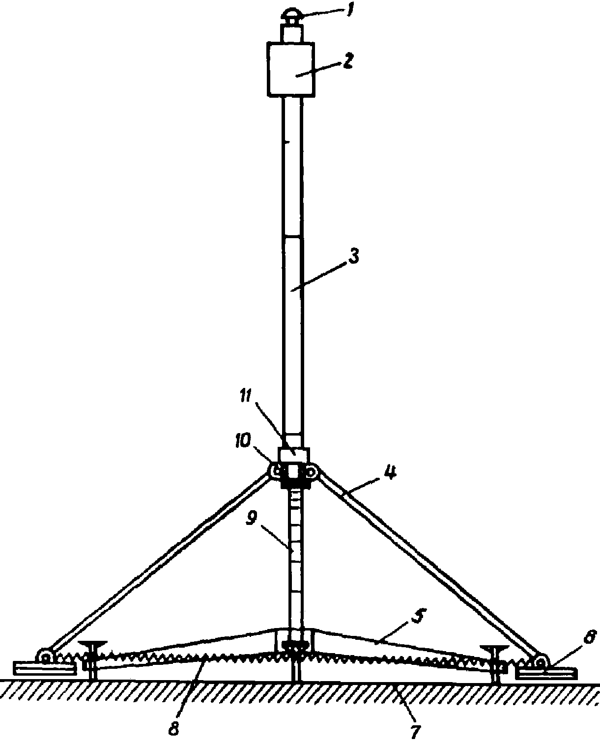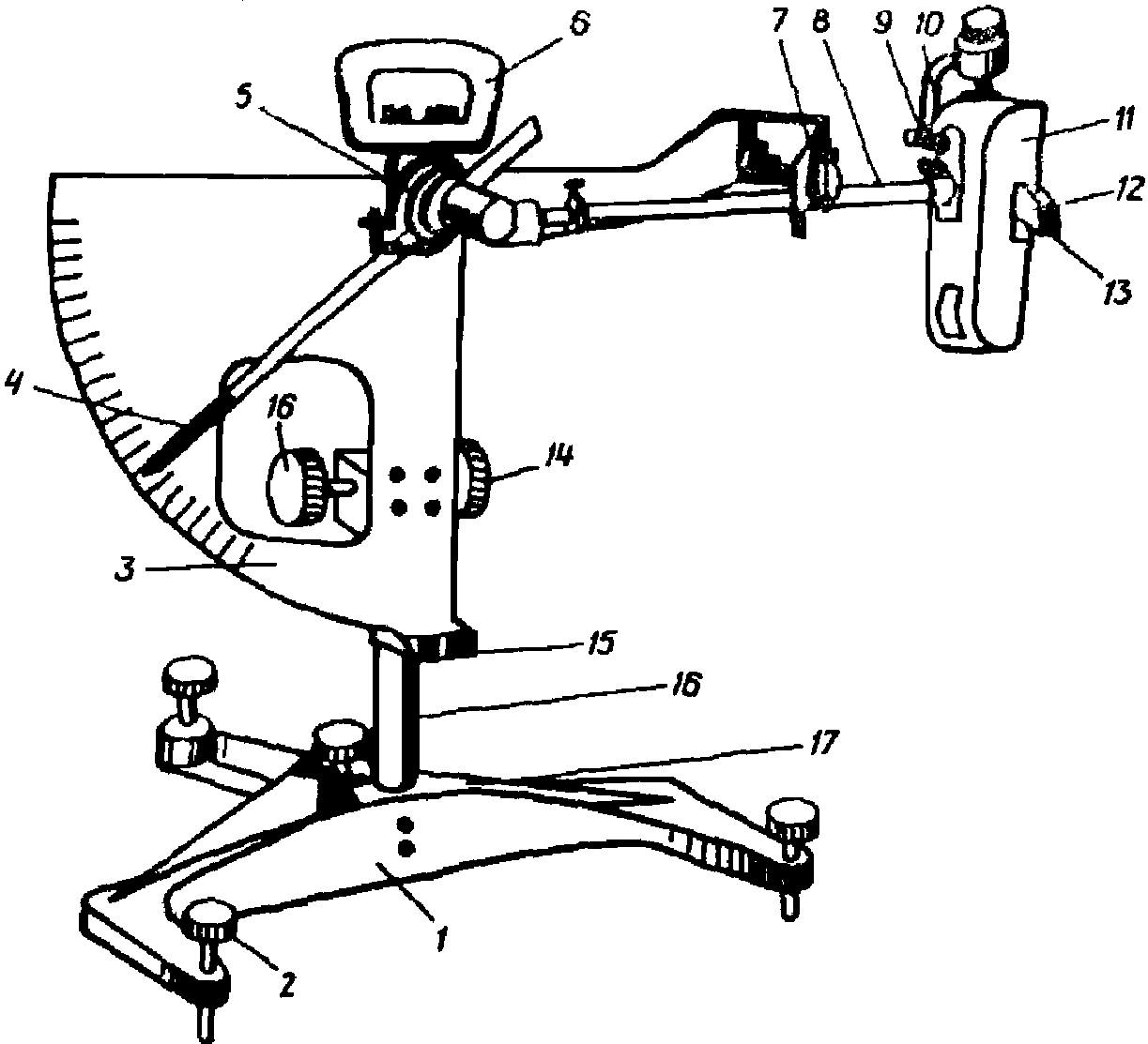 Подставка прибора 5 служит для установки прибора на дорожном покрытии в вертикальном положении и состоит из трех лап, которые крепятся кронштейном к нижнему концу штанги.