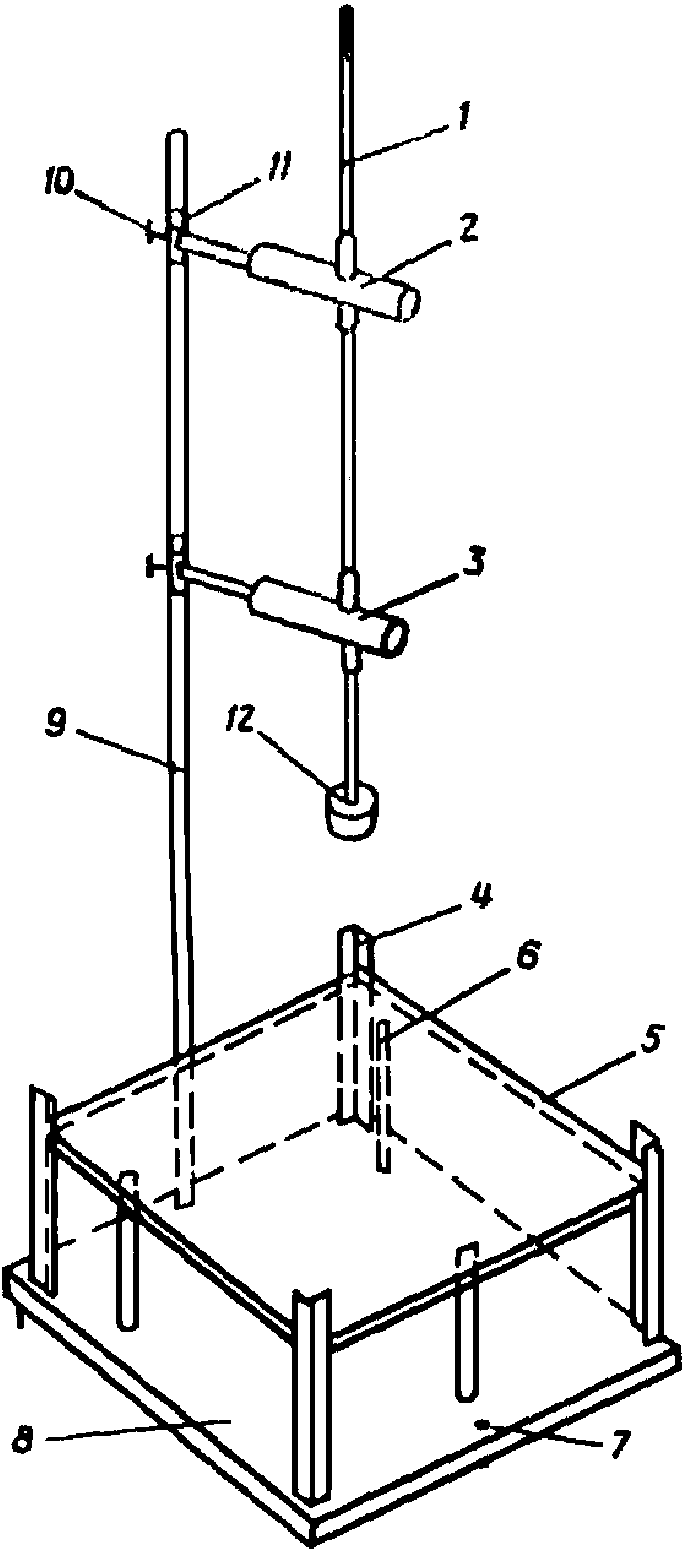 Прибор устанавливают в центральной секции собранной формы и выравнивают его по уровню с помощью металлических пластин размером 40 x 40 x 1 мм. Образец должен выступать над стенками формы на 1 - 2 мм.