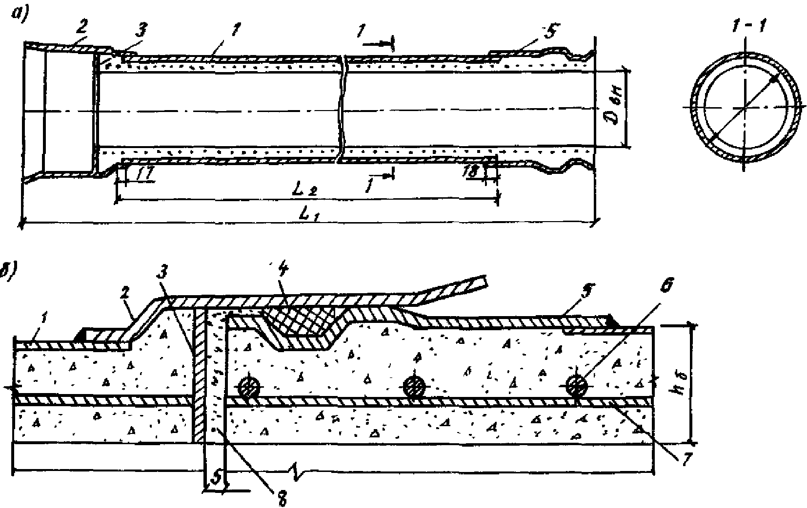 Опалубочный чертеж и схема стыкового соединения труб приведены на рис. 1, а, б.