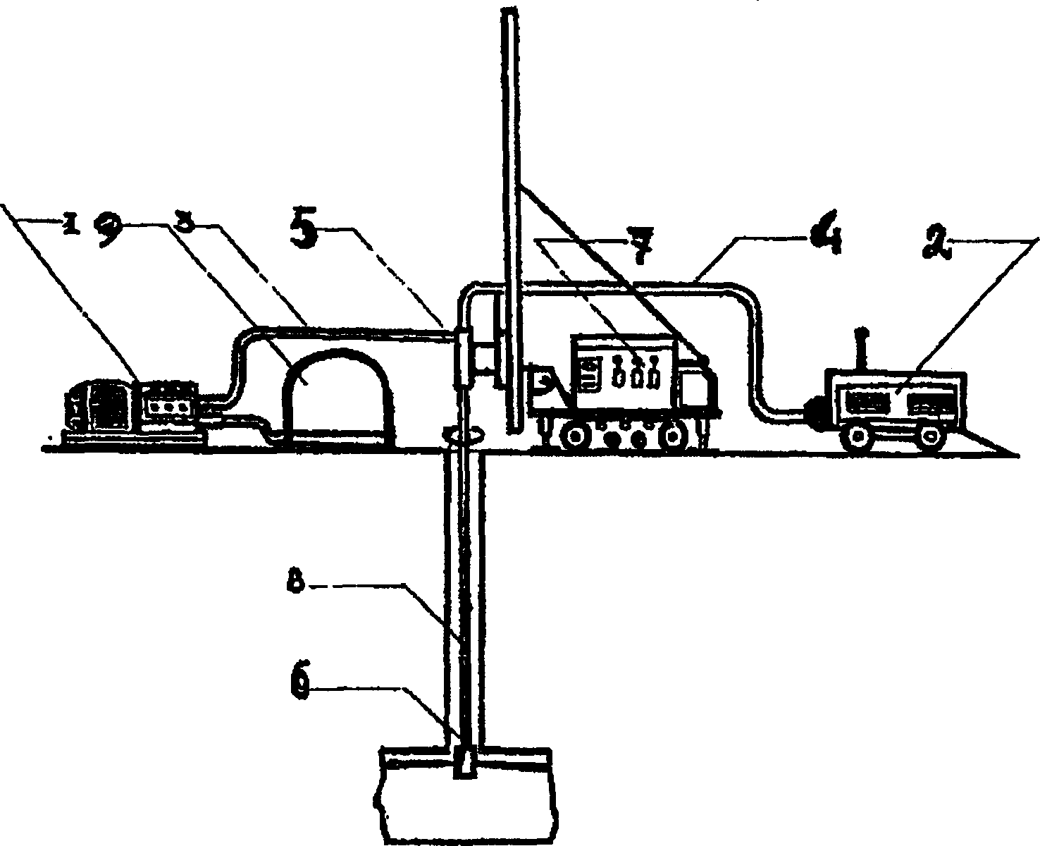 С помощью компрессора (2) по шлангам (4) воздух подается в вертлюг (5) и по штанге (8) подается на мониторную головку.