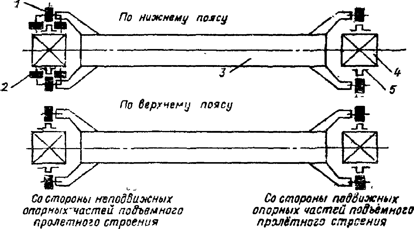 В двукрылом раскрывающемся пролетном строении при наличии на мосту рельсового пути или гребенок (в замковом деформационном шве) следует предусматривать в середине разводного пролета шарнирно-центрирующее устройство для взаимной фиксации крыльев в плане при наводке моста.