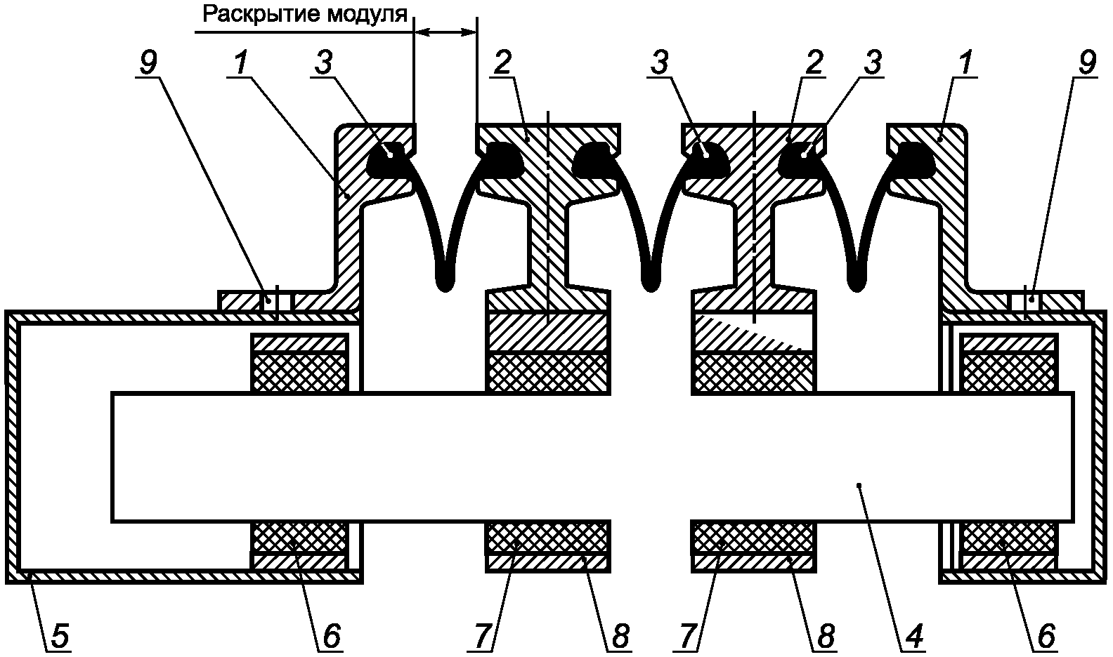 3.14 модульная конструкция деформационного шва: Конструкция деформационного шва с компенсаторами, состоящая из деформационных модулей (или крайних и промежуточных балок), конструктивно аналогичных однопрофильной конструкции деформационного шва, допускаемые перемещения которой равны сумме допускаемых перемещений составляющих ее деформационных модулей.