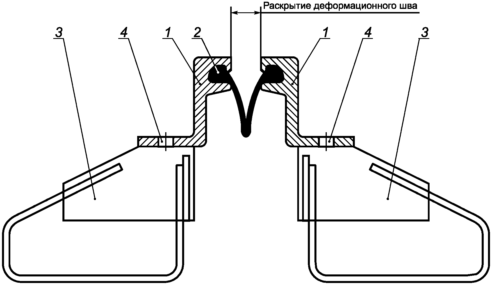 3.12 конструкция деформационного шва: Конструкция, состоящая из резинового компенсатора, устанавливаемого в деформационный зазор мостового сооружения, и крайних (при необходимости крайних и промежуточных) стальных балок, обеспечивающая плавность движения по нему автомобилей и удовлетворяющая требованиям к деформациям пролетных строений мостового сооружения без нарушения герметичности за счет деформации резинового компенсатора (компенсаторов), закрепленного на крайних балках (или промежуточных и крайних).