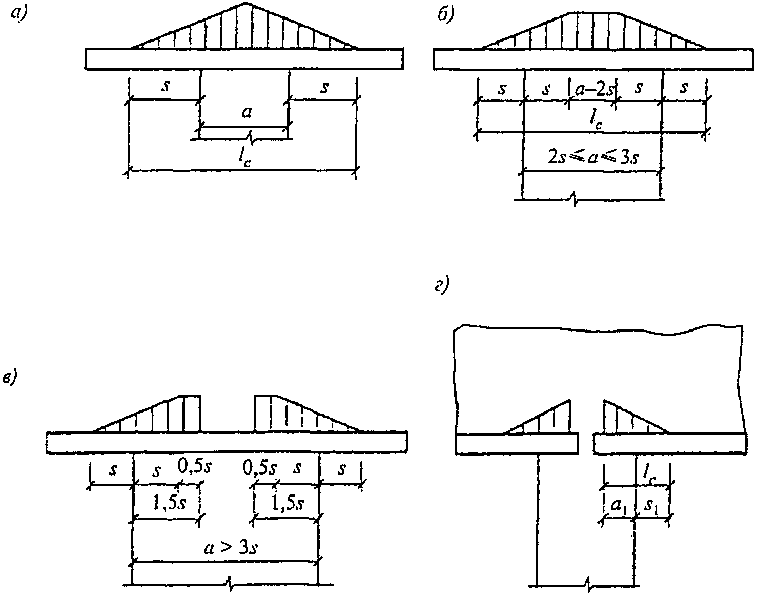 Если нагрузка от перекрытия сосредоточена на отдельных участках (опирание ферм, балок и пр.), при статическом расчете допускается принимать ширину полки тавра согласно следующим указаниям: не более 6h и ширины стены между проемами (H - высота стены от уровня заделки, h - толщина стены). При отсутствии пилястр и передаче на стены сосредоточенных нагрузок ширина участка 1/3H принимается в каждую сторону от края распределительной плиты, установленной под опорами ферм или прогонов.