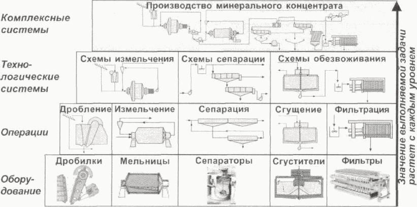 - производственные процессы добычи (подготовительные работы - проходка и крепление выработок, очистная выемка и вспомогательные процессы - транспортировка и управление качеством руд, доставка людей, материалов и оборудования, содержание выработок в рабочем состоянии, вентиляция, водоотлив и др.) и обогащения (подготовительные - дробление, измельчение, классификация в воздушной и водной средах, основные - гравитационное обогащение, магнитное обогащение, электрическое обогащение, специальные - усреднение руд, рудосортировка, избирательные методы раскрытия минералов, комбинированные процессы, вспомогательные - сгущение, фильтрование и сушка, химические процессы в комбинированных схемах обогащения руд) руд и россыпей цветных металлов и отходов горно-металлургических производств;