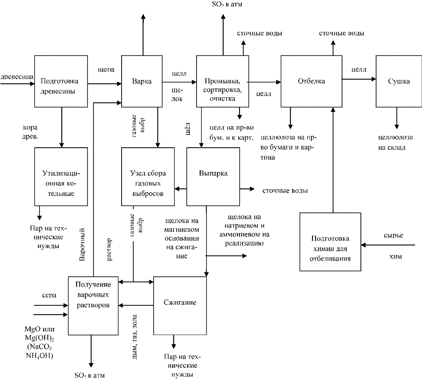 - производственные процессы вспомогательных производств (приготовление химикатов для отбелки, регенерация известкового шлама, очистка сточных вод).