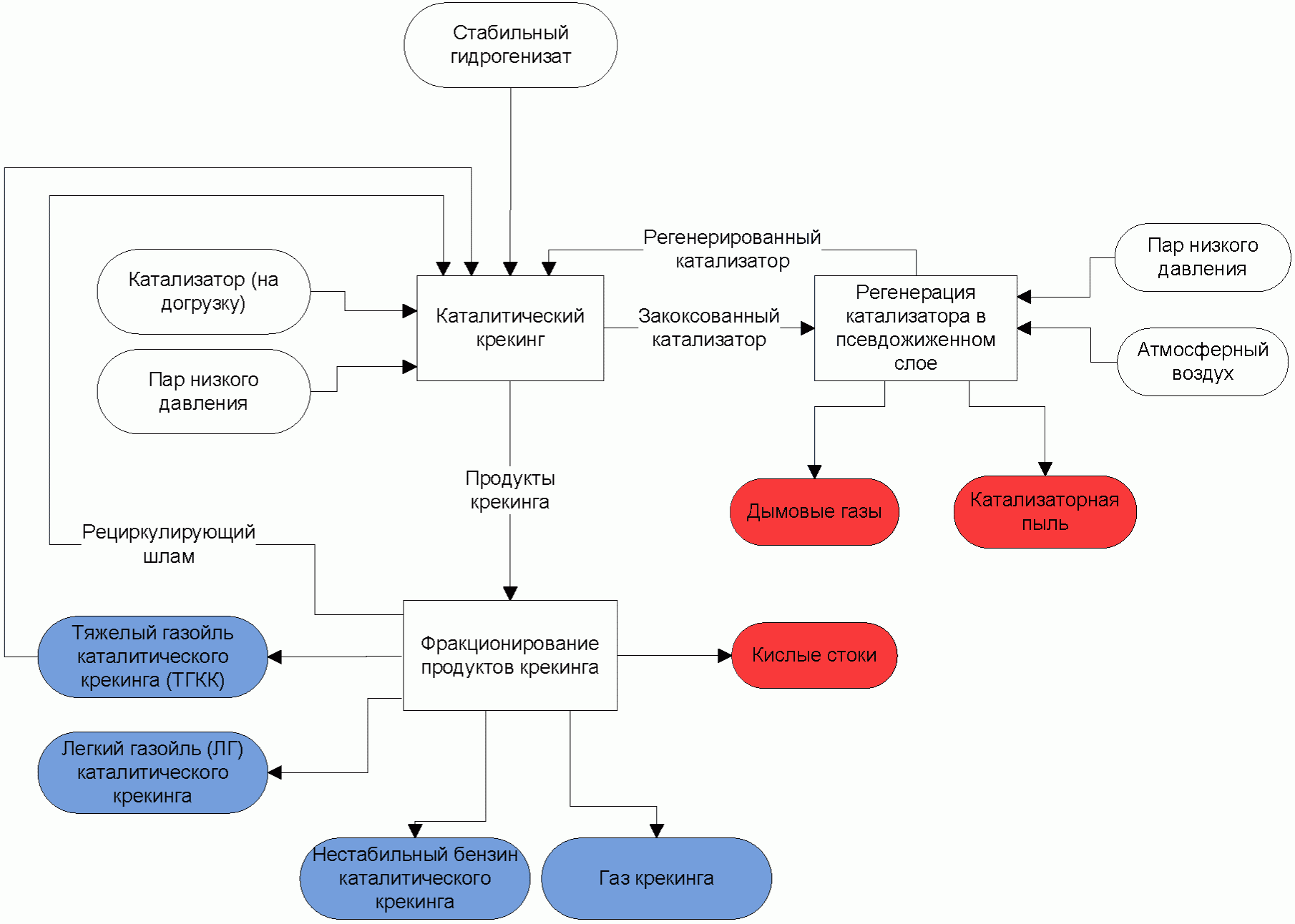 - Каталитический крекинг с максимальным выходом легкого газойля. Основными экологическими преимуществами процесса являются снижение выбросов CO и CO2, а также оксидов серы и азота, из регенератора вследствие снижения выхода кокса в процессе крекинга, а также снижение образования остатка - тяжелого газойля. Главным экономическим аспектом технологии является увеличение выхода легкого газойля - сырья для производства реактивного и дизельного топлив. Совместное применение специальных катализаторов и технологических приемов позволяет увеличить выход легкого газойля на 10% об (абс). Вторичным аспектом является снижение выхода побочного продукта крекинга - тяжелого газойля;