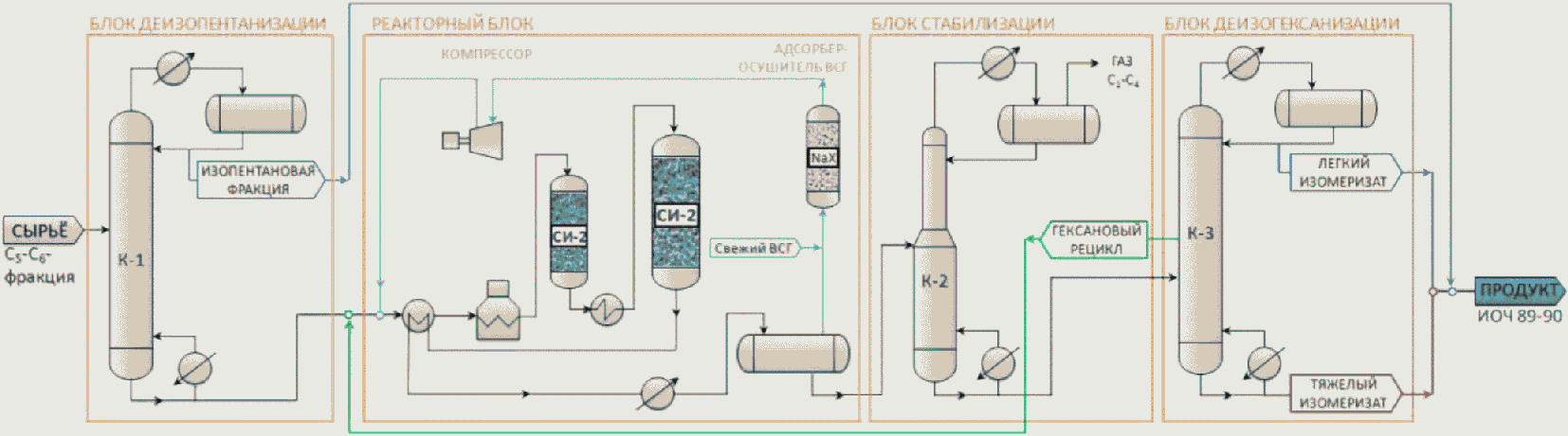 - Технологии низкотемпературной изомеризации C7, позволяющие снизить энергозатраты за счет организации схемы разделения потоков, ректификации и рекуперации тепла, увеличения межрегенерационного пробега;