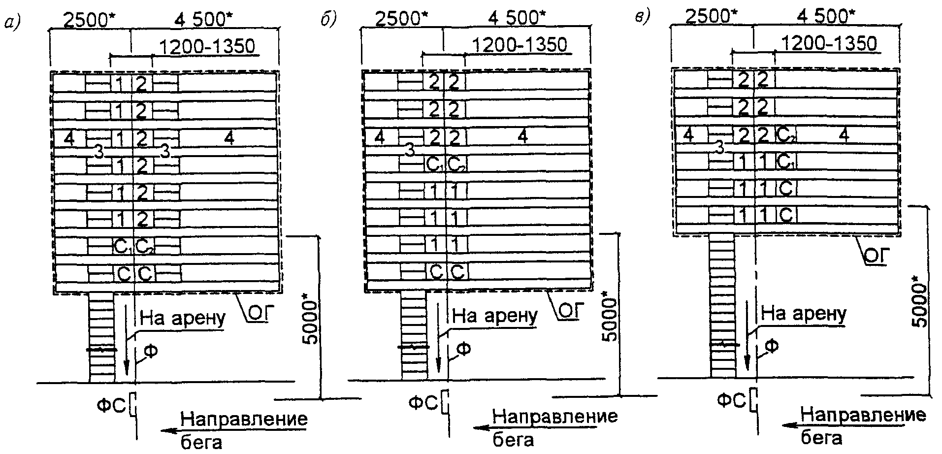 длина | ширина | минимальная высота до низа выступающих конструкций | при учебно-тренировочных занятиях в зале | при соревнованиях на арене или в зале, чел. | длина | ширина | минимальная высота (в пределах площади арены) |