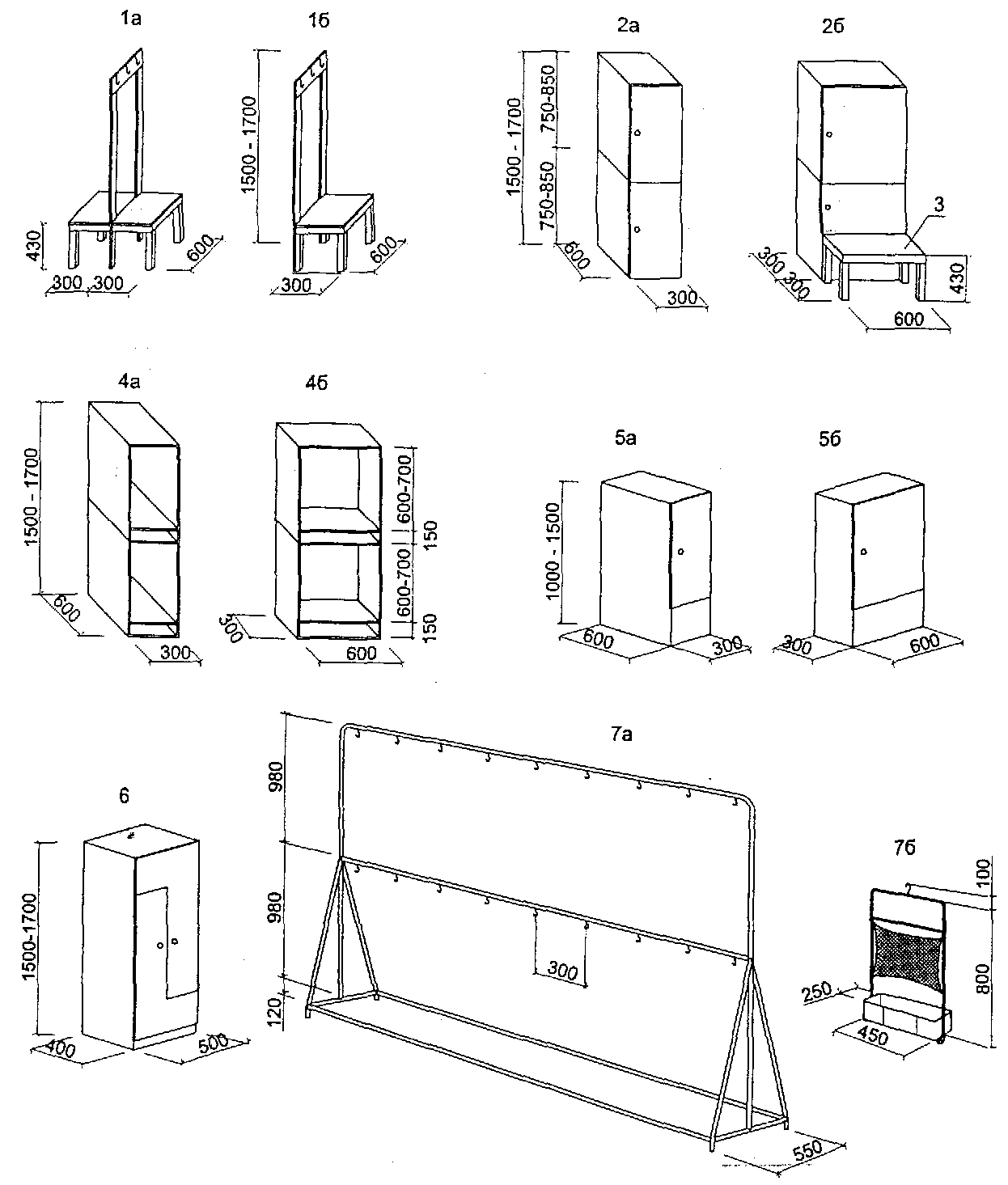 6 - двухсекционный шкаф для домашней одежды; 7 - вешалка