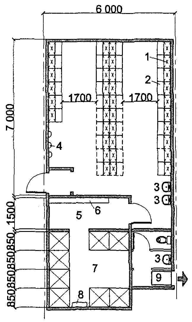 3 - проходные кабины для переодевания; 4 - перемещаемые