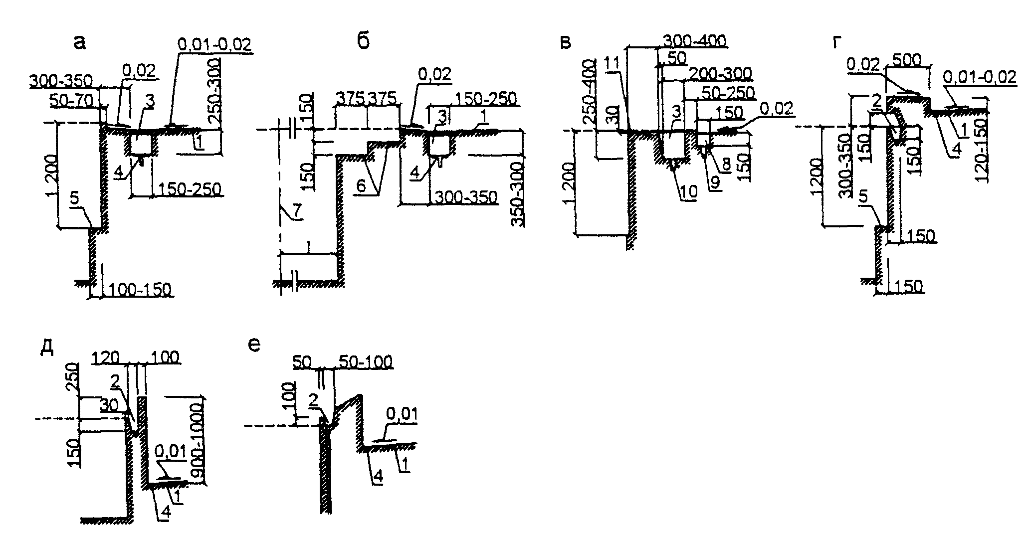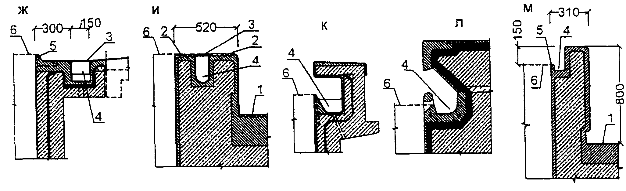 3 - четыре слоя гидроизола на мастике; 4 - цементная стяжка;