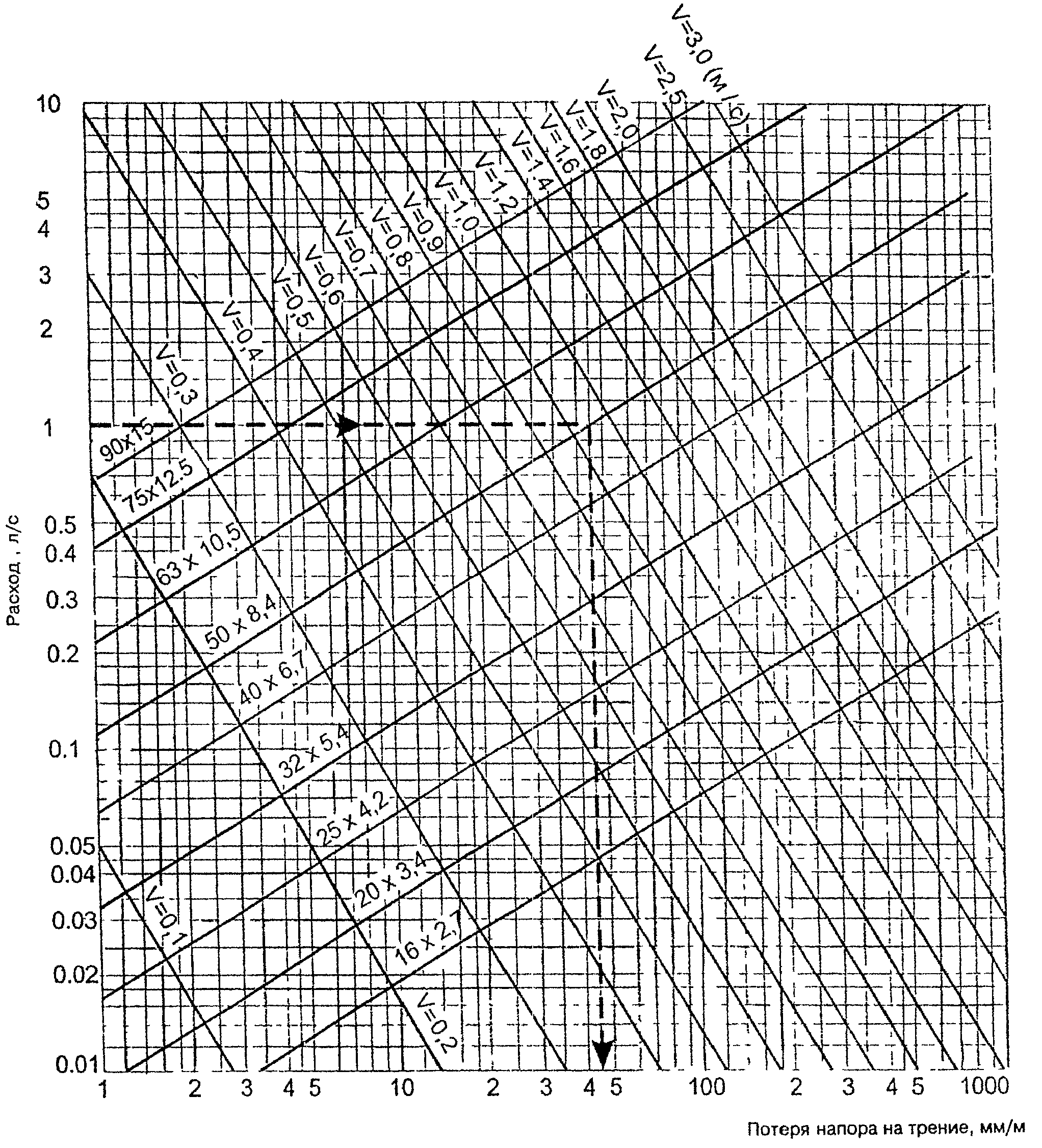 По номограмме: средняя скорость течения жидкости 1,1 м/с, потеря напора 45 мм/м