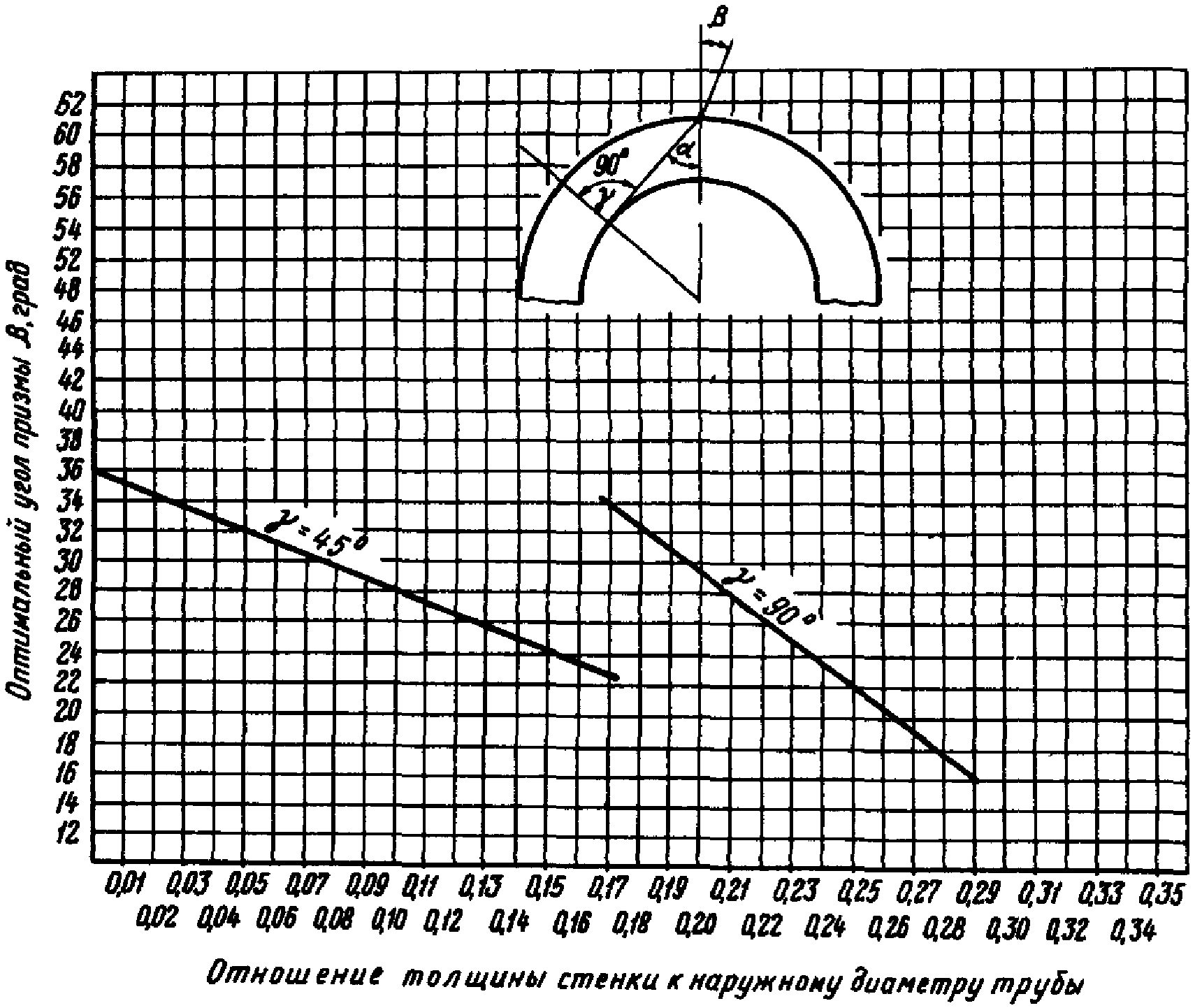ультразвукового луча с дефектом, равным 90°. Оптимальные углы наклона призмы выбираются по прилагаемому графику (рис. 15).