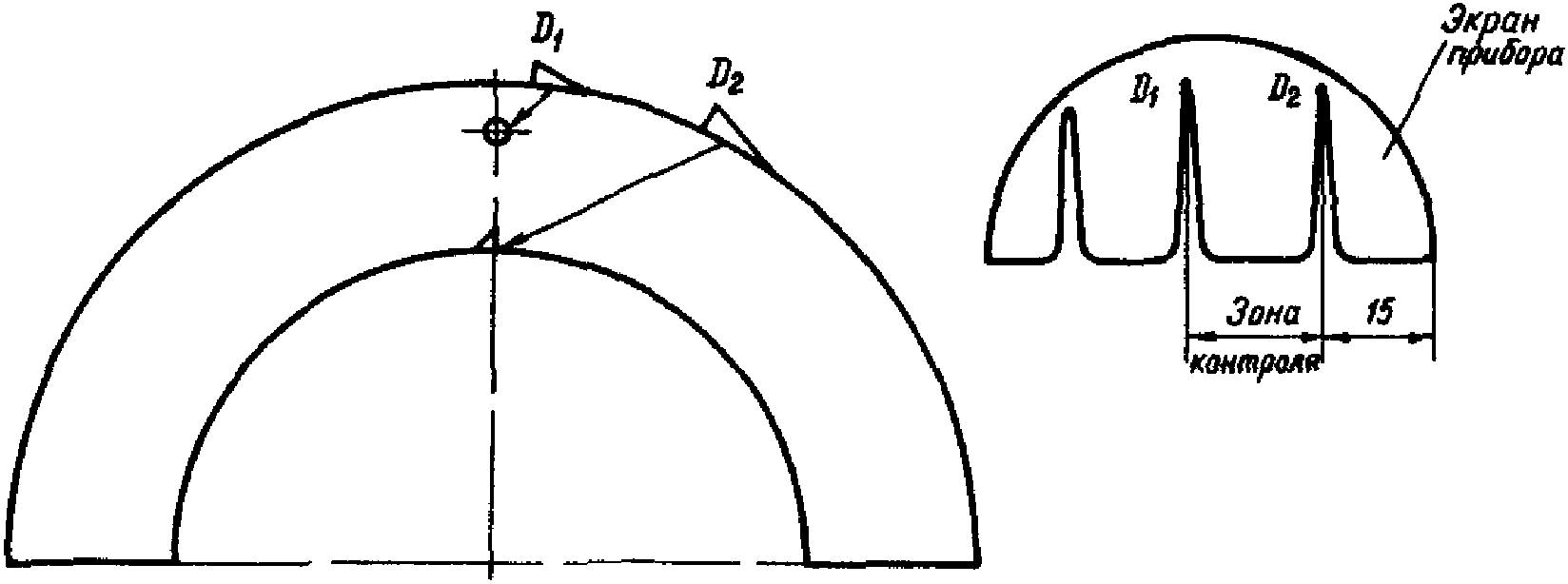 2. Настройка дефектоскопа производится по испытательному образцу, изготовленному из прямого участка трубы. Материал образца должен соответствовать материалу контролируемого гиба (рис. 16).