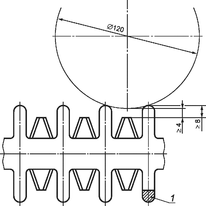 закругленная вершина (blunt extension): Незаточенная часть режущего механизма или часть ножевого полотна, установленная на режущем механизме, выступающая за пределы зубьев режущего лезвия (см.