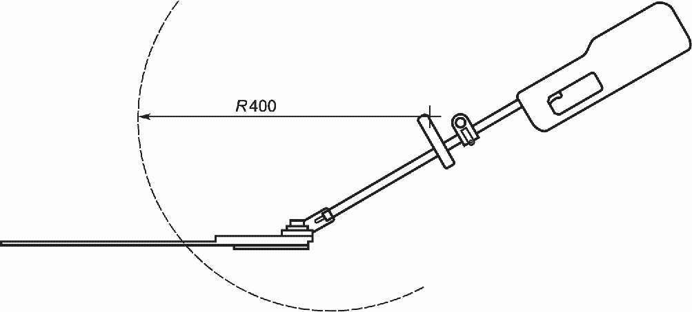Кусторез со штангой в соответствии с перечислением b) 8.14.2 настраивают на максимальную длину между передней рукояткой и концом режущего механизма, а ось режущего механизма совмещают с осью вала, насколько это возможно. Шнур питания, если таковой имеется, должен быть удален в точке входа в машину. Машина должна быть испытана со всеми батареями и вариантами шнура питания, указанными в перечислении b) 8.14.2, при установке машину испытывают с установленными на нее: