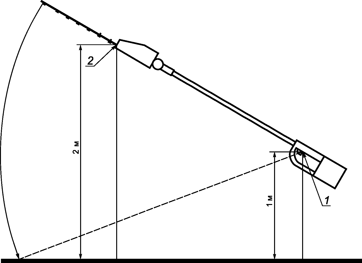 Кусторез со штангой, настроенный на максимальное удлинение и не подключенный непосредственно к сети или к неизолированному источнику питания, с установленной съемной аккумуляторной батареей дополнительно подвергают трехкратному сбрасыванию на бетонную поверхность в самых невыгодных положениях. При каждом дополнительном сбрасывании кусторез с возможностью поворота устанавливают так, чтобы задняя рукоятка с органом управления режущим механизмом находилась на высоте 1 м над бетонной поверхностью, а ближайшая к задней рукоятке режущая кромка лезвия - на высоте 2 м над бетонной поверхностью (см. рисунок 121).