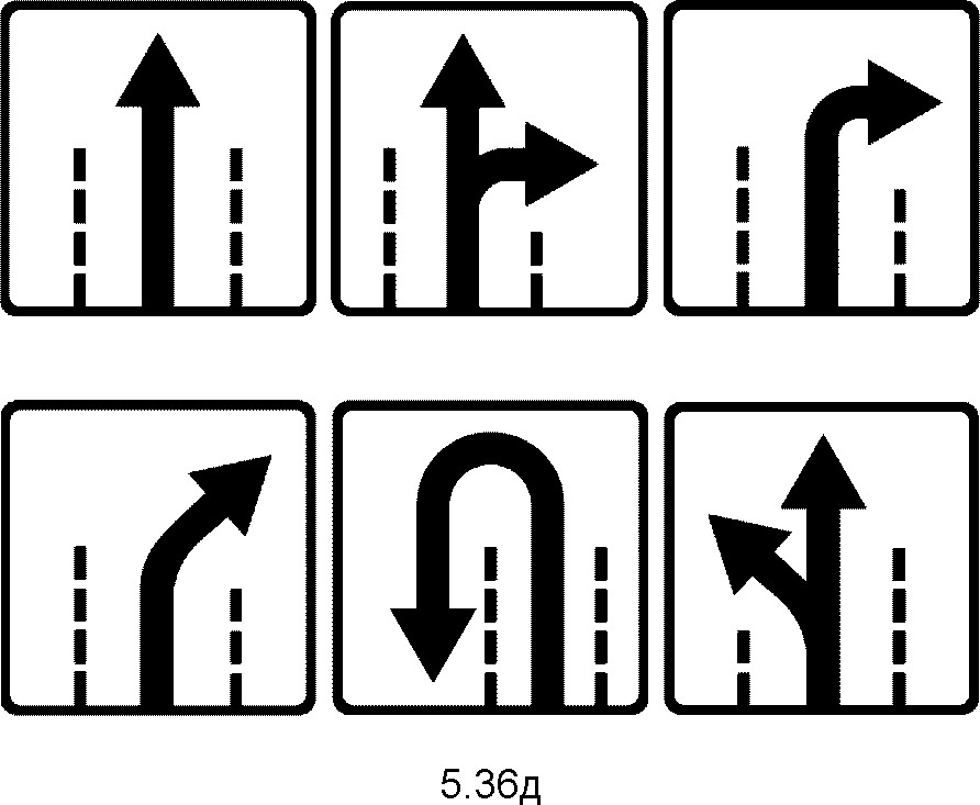 5.36д Направления движения на следующем перекрестке Указывает направление движения по полосам следующего перекрестка. Информирует водителей о необходимости заблаговременного перестроения. Знаки разрешается устанавливать только над основными знаками 5.15.2 "Направление движения по полосам". |