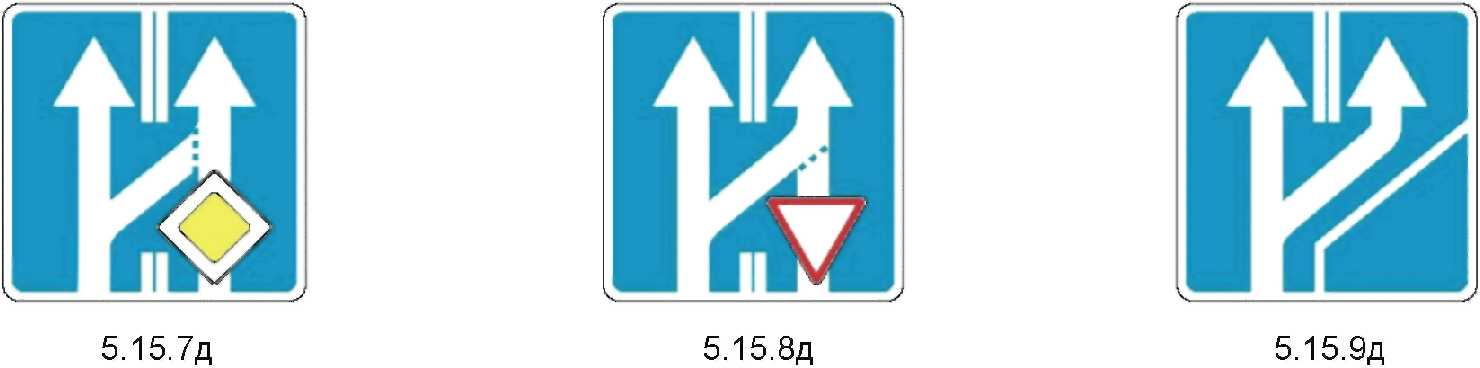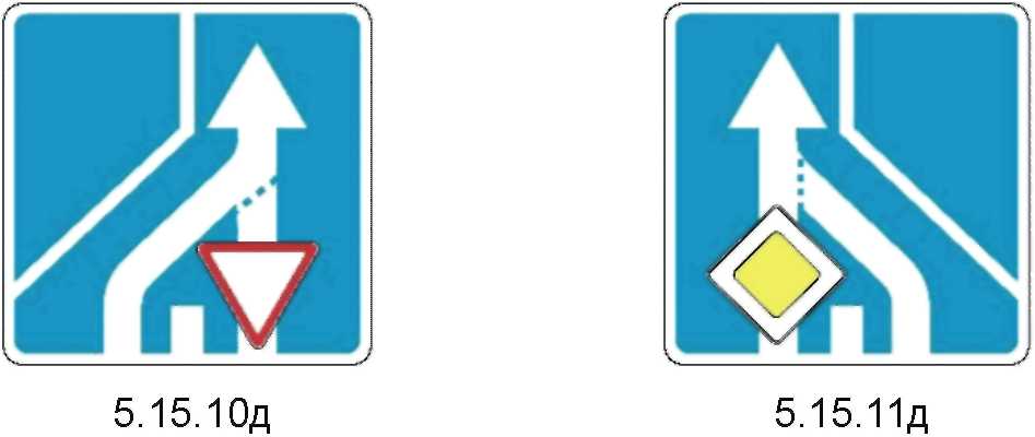 1  | 5.15.8д Перестроение на параллельную проезжую часть Информирует водителей о приоритетах движения при перестроении на параллельную проезжую часть. Используется в дополнение к основным знакам приоритета 2.1 и 2.4. |
