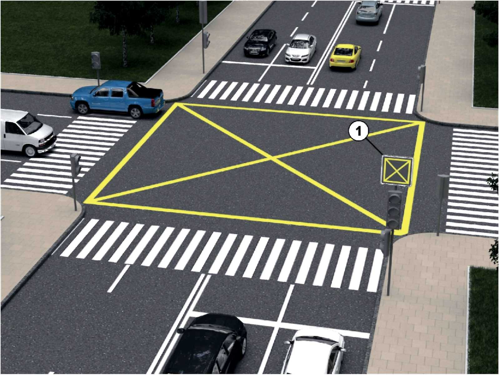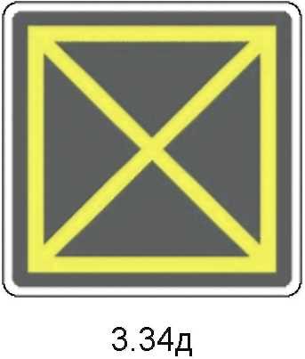 1  | 3.34д Запрет въезда на перекресток в случае затора Применяется для дополнительного визуального обозначения перекрестков или участков проезжей части, на которых нанесена разметка 3.34д, запрещающая выезжать на занятый перекресток и создавать тем самым препятствия для движения транспортных средств в поперечном направлении. Знак устанавливают перед пересечением проезжих частей. |