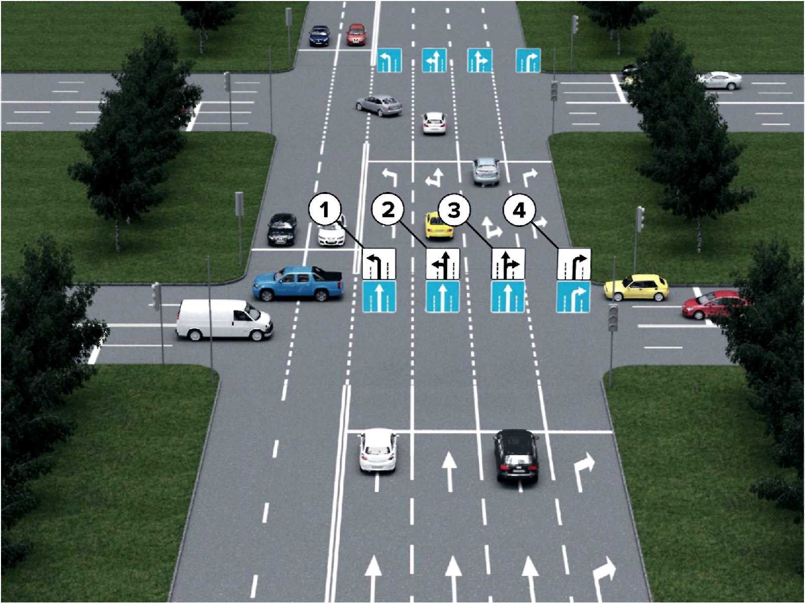 Указывает направление движения по полосам следующего перекрестка. Применение данных знаков допускается, если до следующего перекрестка не более 200 метров, и специализация полос на нем отличается от перекрестка, на котором устанавливаются данные знаки.